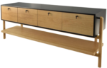 O aparador Franchini é confeccionado em MDF laqueado, com prateleira e gavetas revestidas com lâmina natural de madeira, pés em madeira maciça e haste lateral metálica. As gavetas possuem corrediças telescópicas e puxadores em aço carbono. Há três opções de tamanhos