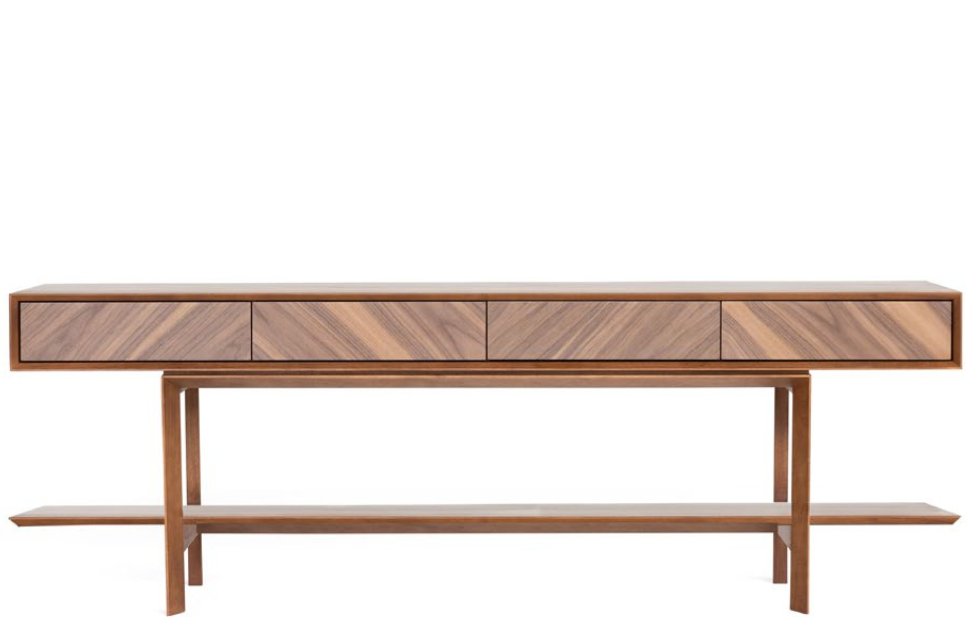Aparador Win com um design moderno e minimalista, uma estrutura em metal que sustenta o corpo principal de madeira com gavetas. As gavetas possuem um desenho de veios em diagonal, criando uma estética visualmente dinâmica e sofisticada. O móvel é completado por uma prateleira inferior, oferecendo espaço de armazenamento adicional e funcionalidade.
