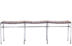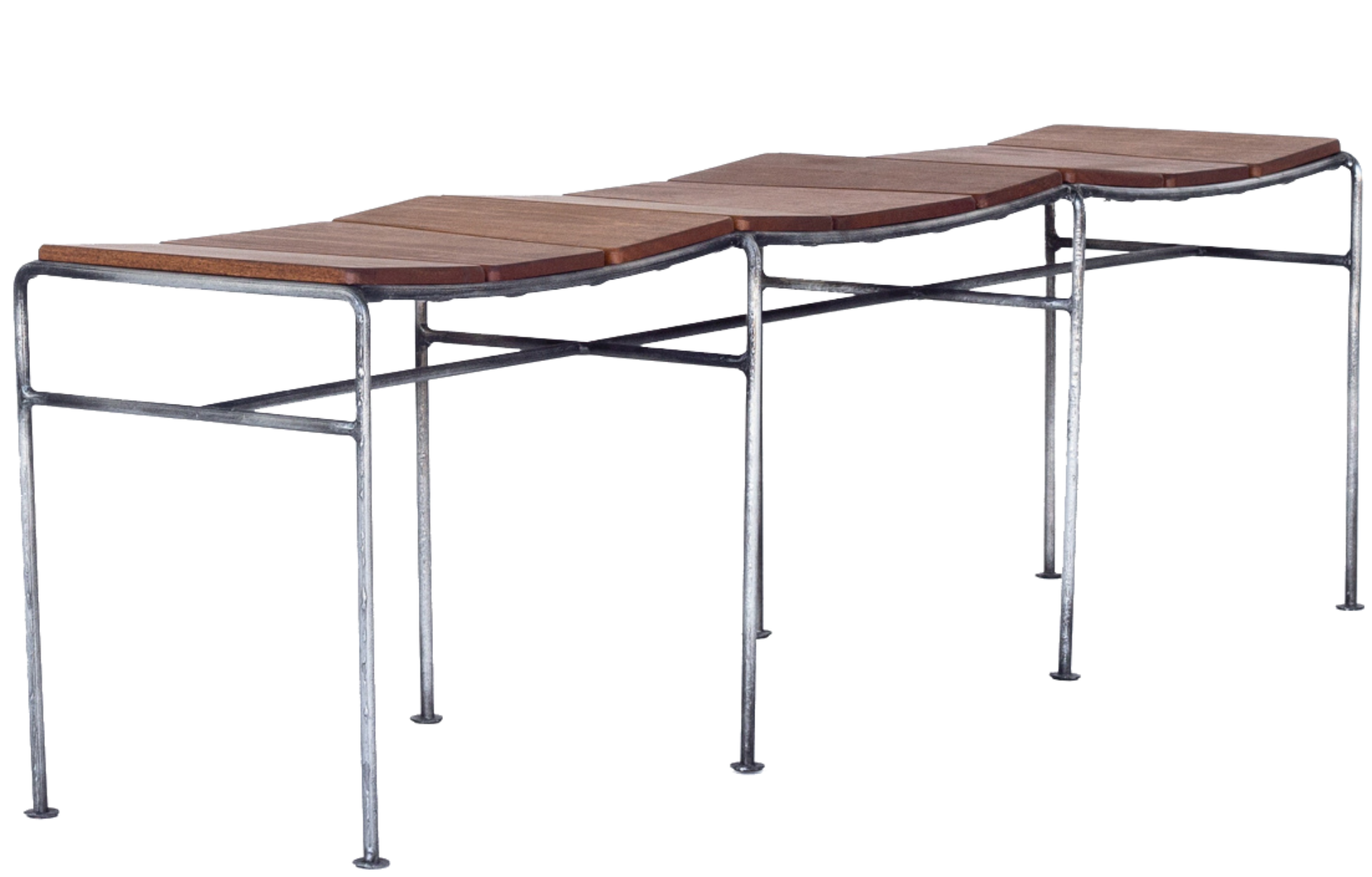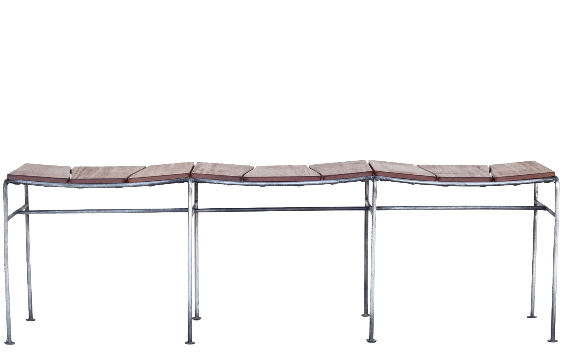 Banco Isma com formato reto apresenta uma estrutura de aço tubular, que sustenta três assentos individuais em tábuas de madeira. A peça foi concebida para oferecer versatilidade e adaptação a diferentes espaços, combinando a robustez do metal com o conforto orgânico da madeira, resultando em um design funcional e contemporâneo.