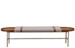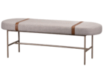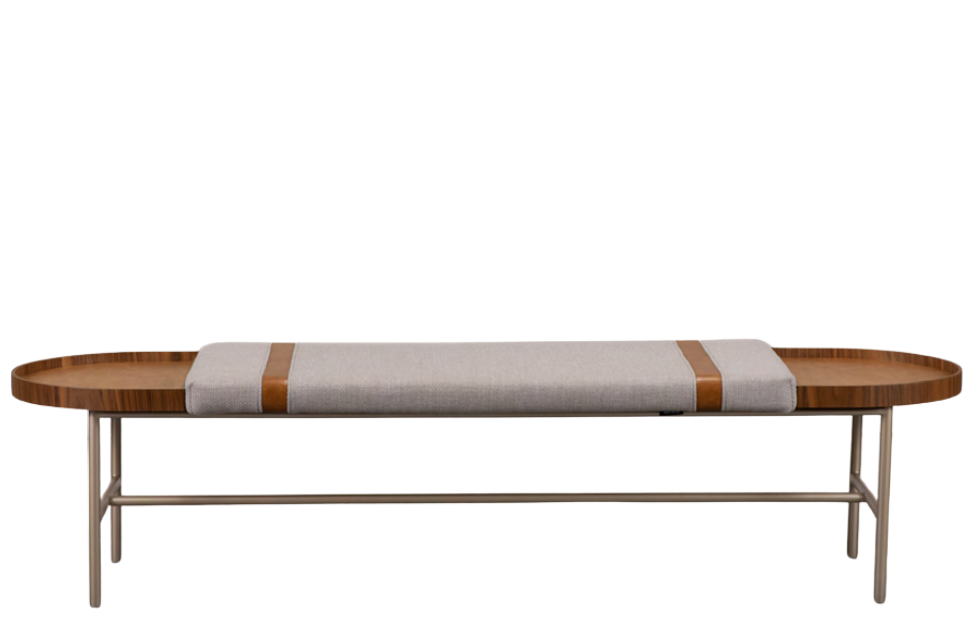 Banco Ostuni com assento estofado, tiras em PU ou recouro e opção de duas bandejas lâminadas com fundo revestido em recouro no mesmo acabamento das tiras. Estrutura metálica pintada.