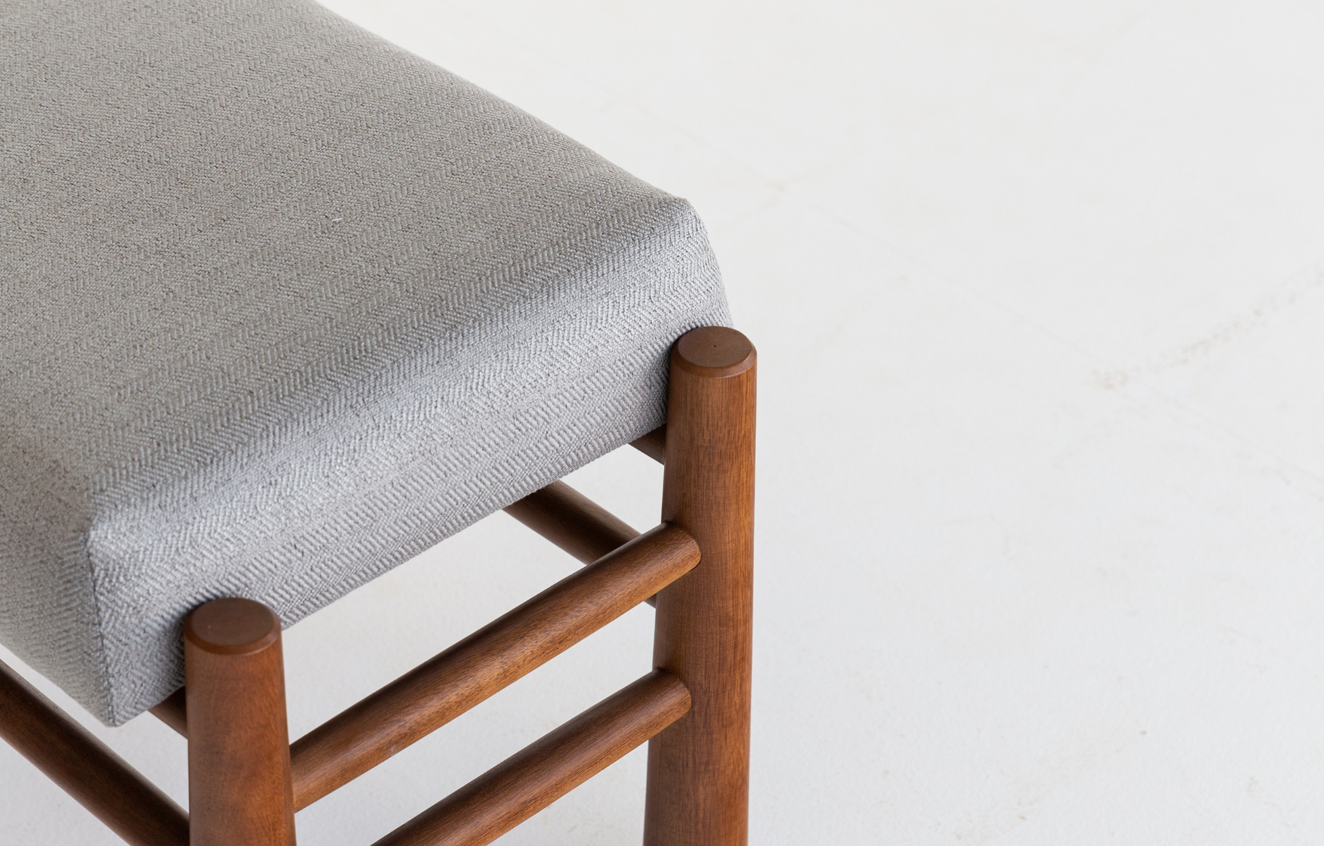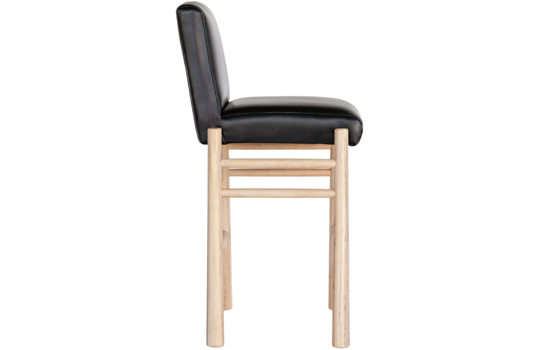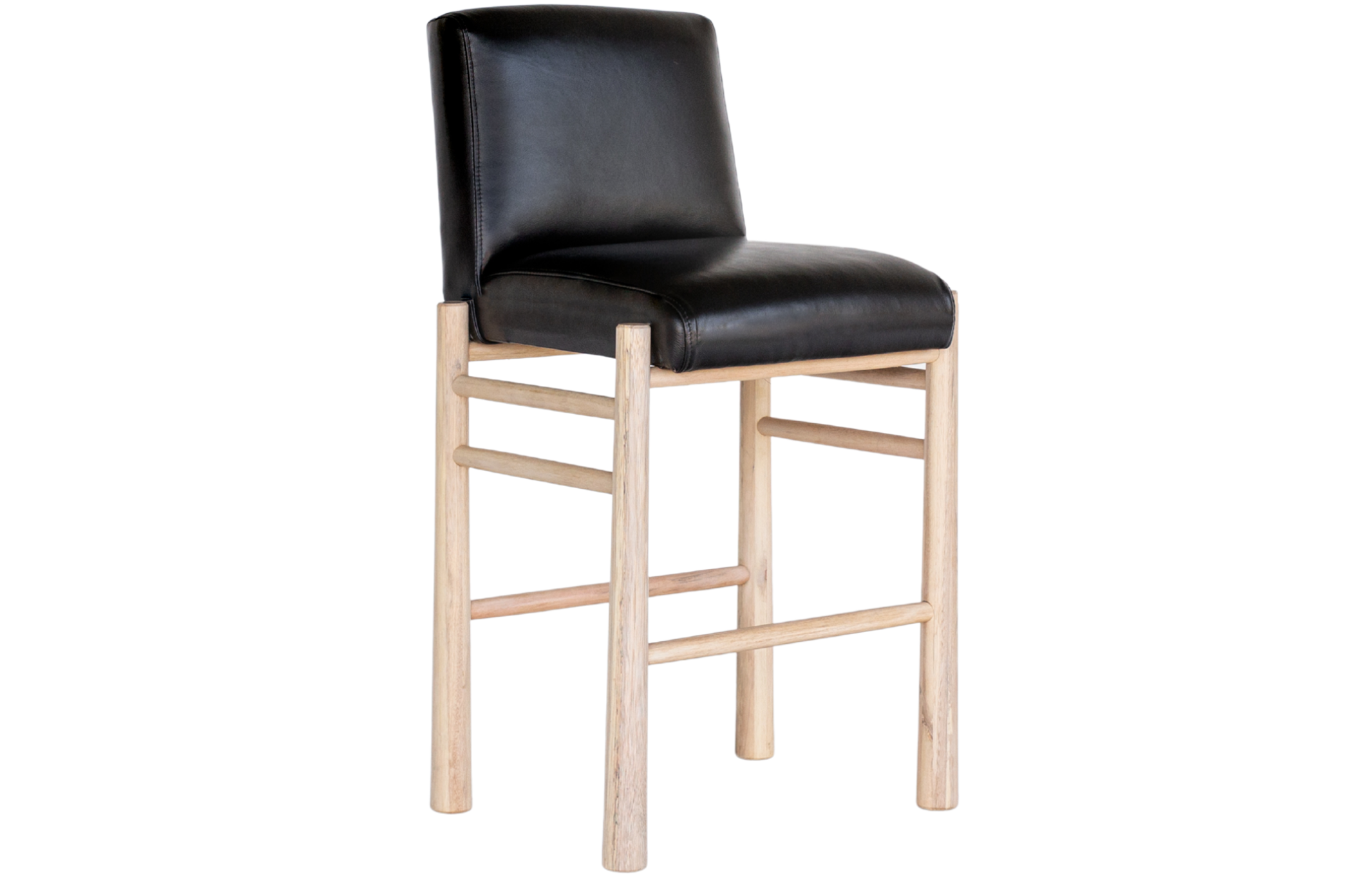 Banco Swift Concha com estrutura em madeira maciça, possui assento e encosto estofados que garantem conforto. As linhas retas da base e a leve curvatura do assento criam um design moderno e funcional, ideal para cozinhas ou áreas gourmet.