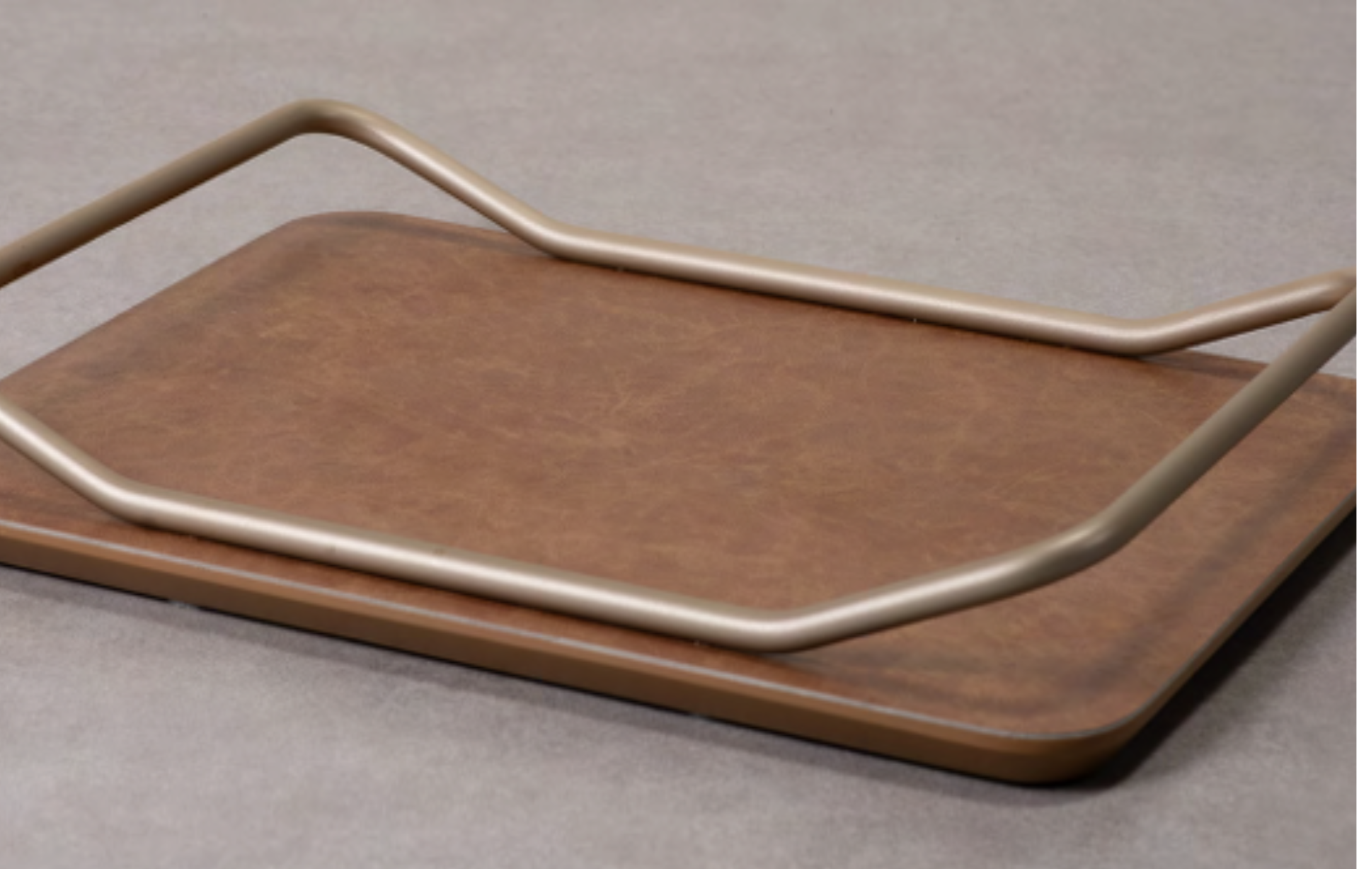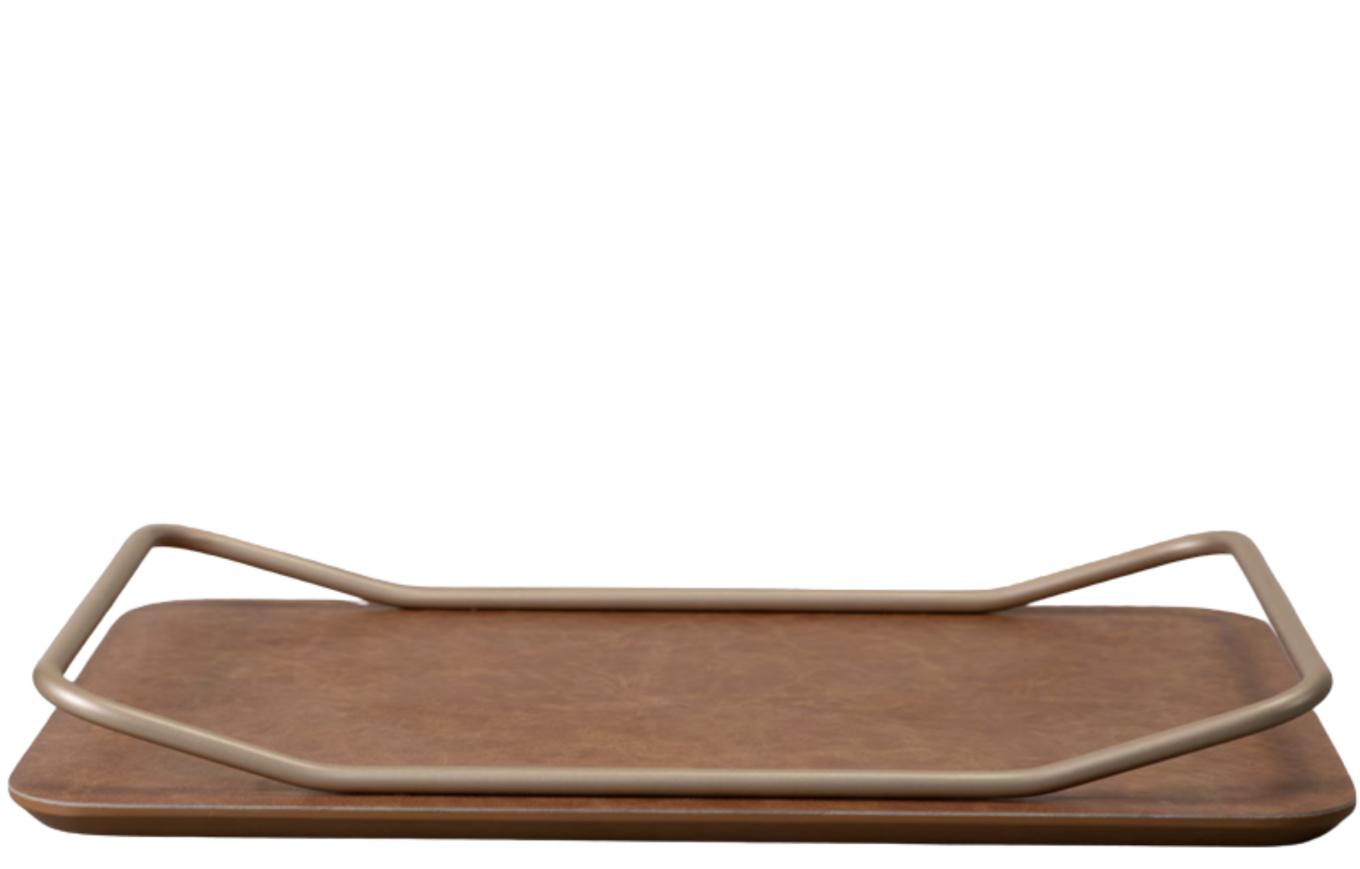 Bandeja Accor com tampo em recouro e pegador em aço carbono pinado, disponível com ou sem detalhe em trama de couro.