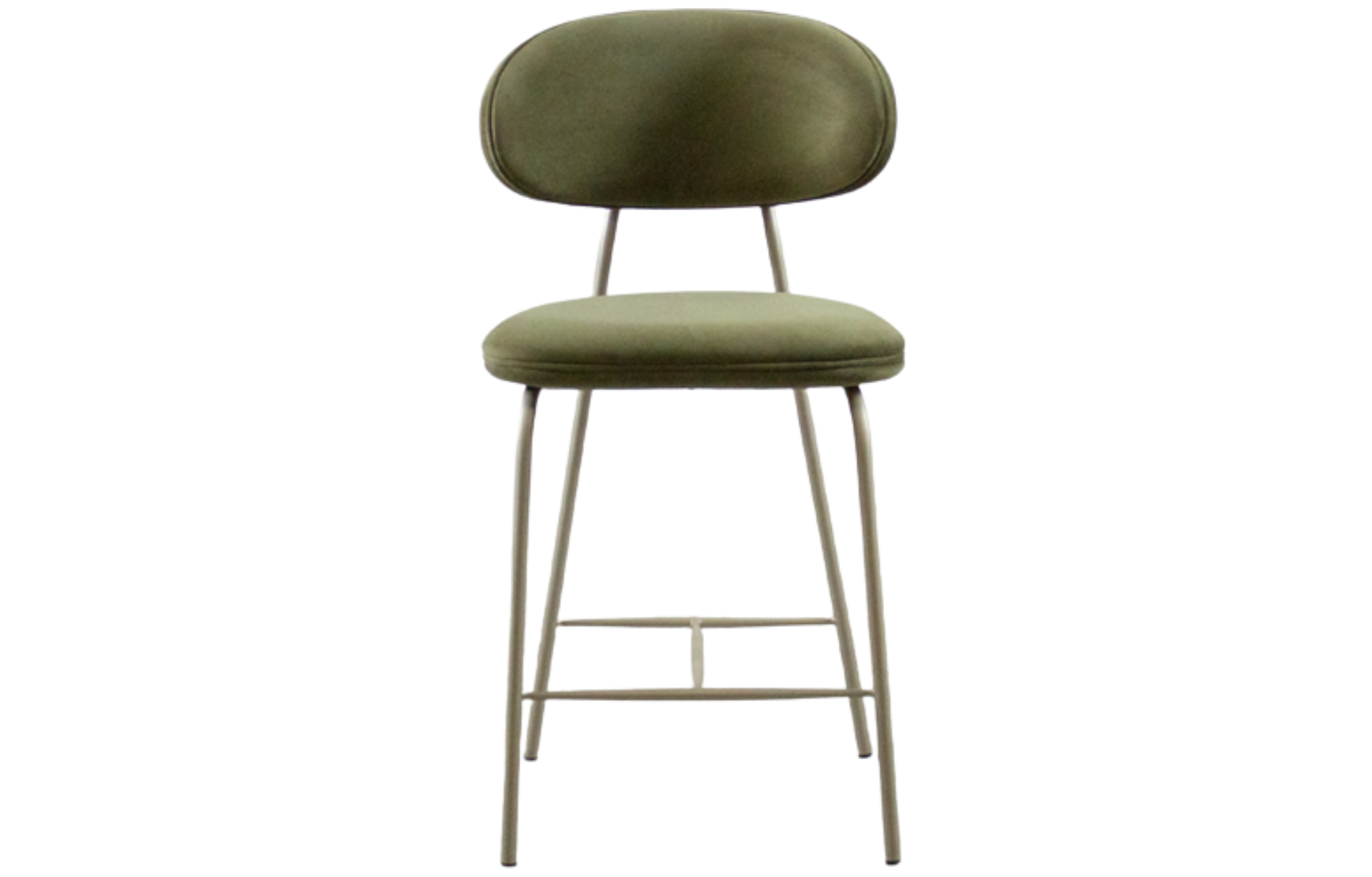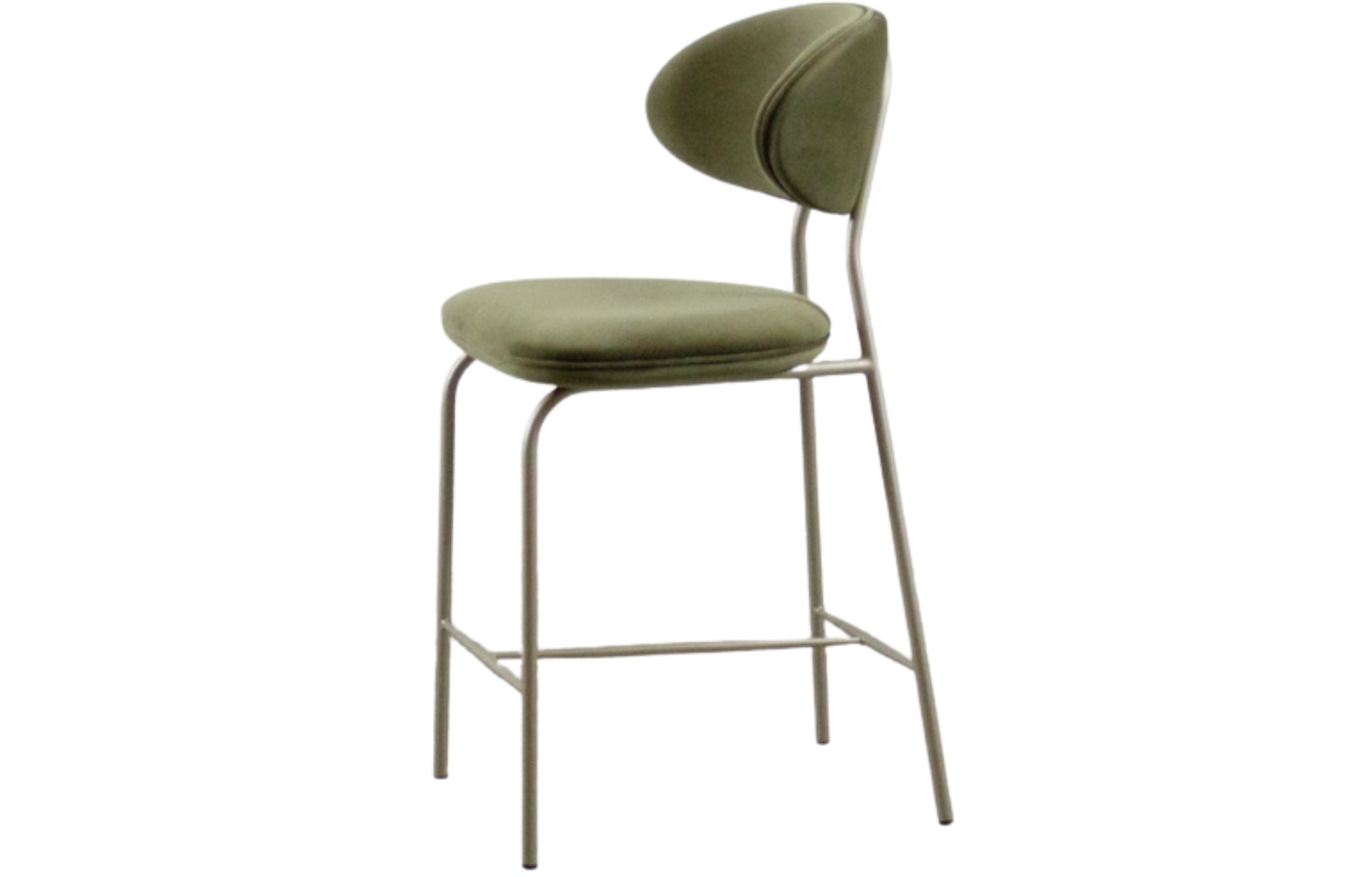 Banqueta Calama com assento e encosto estofados, estrutura em aço carbono pintado e detalhe em madeira natural no encosto.