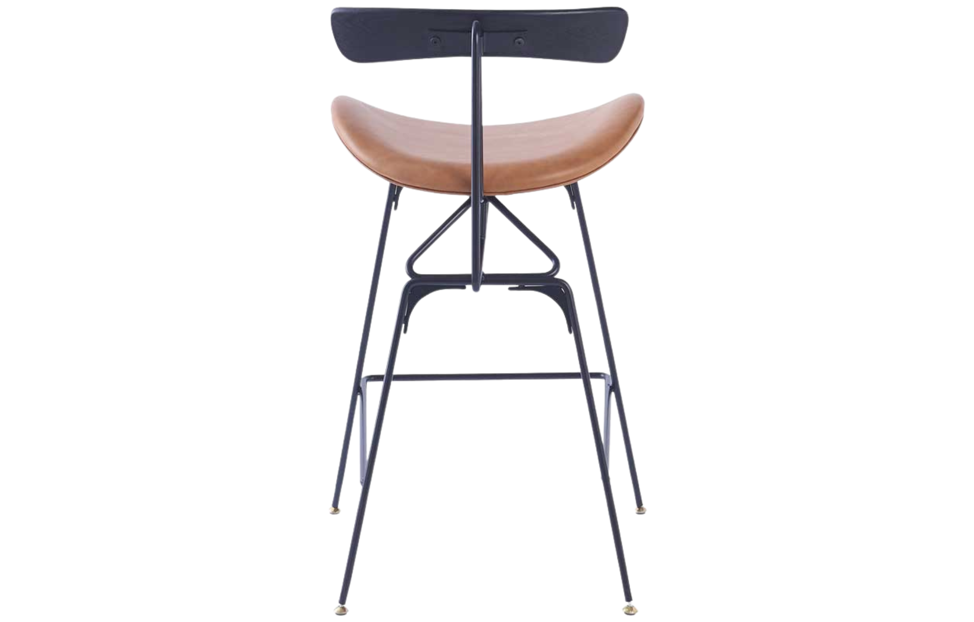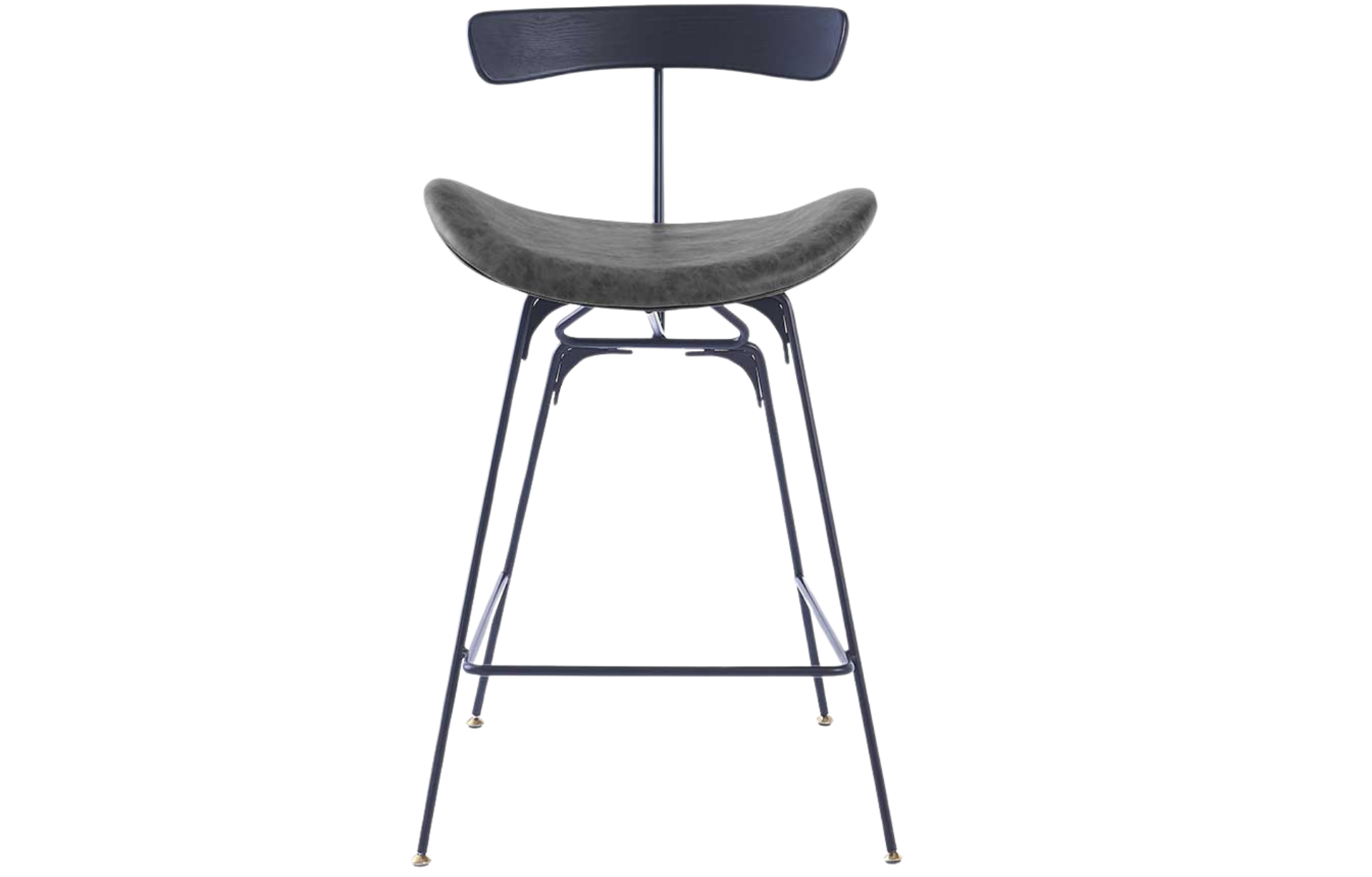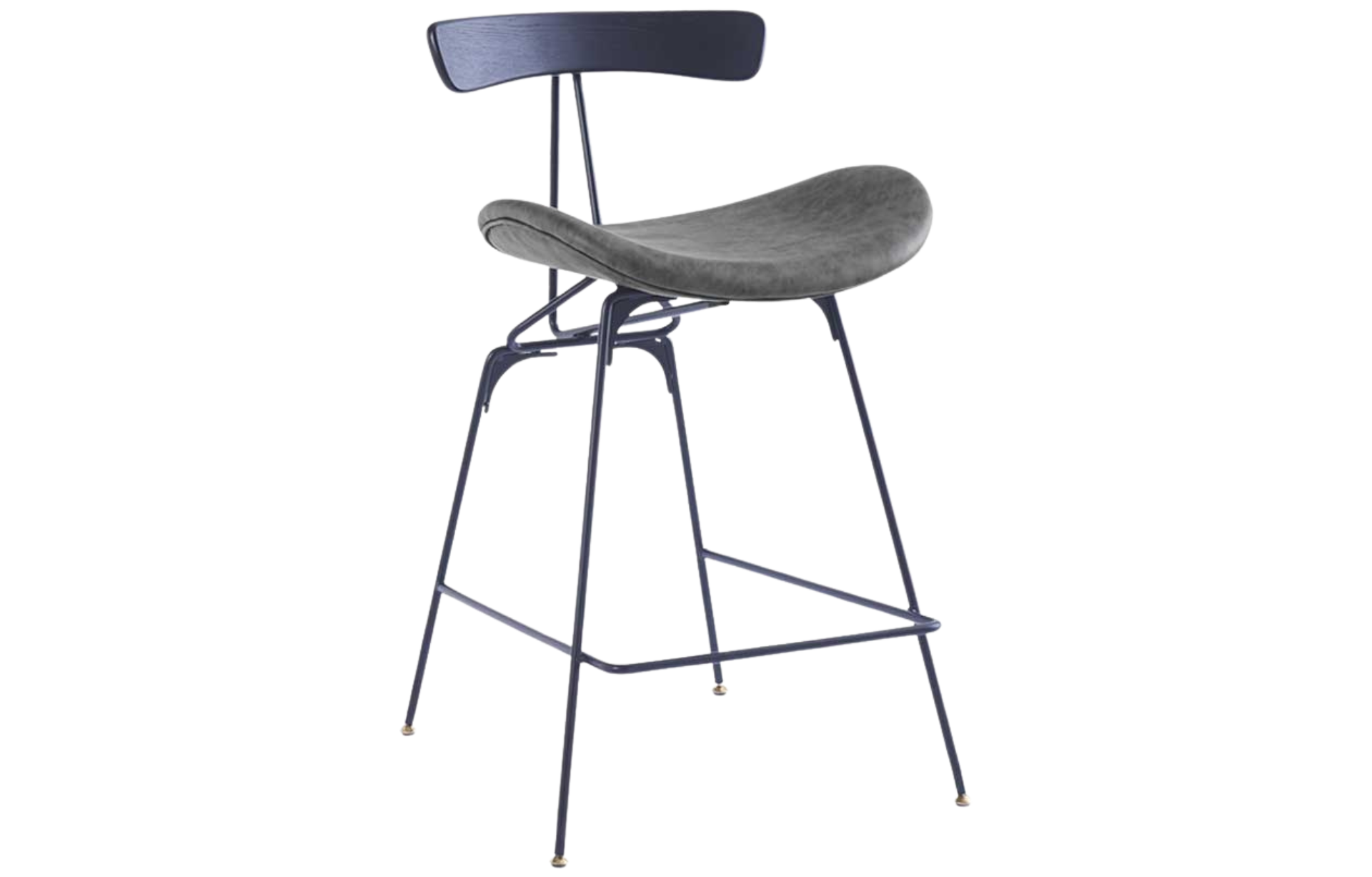Banqueta Jives Baixa estofada em PU com base em aço pintada à pó e pés com regulagem de altura.