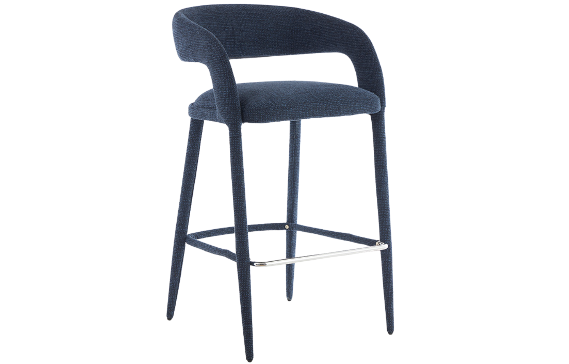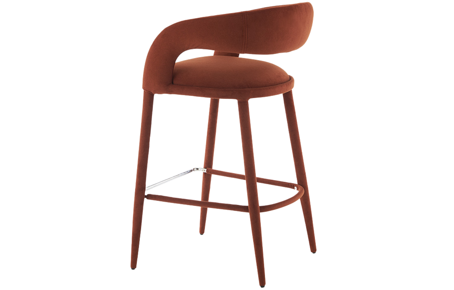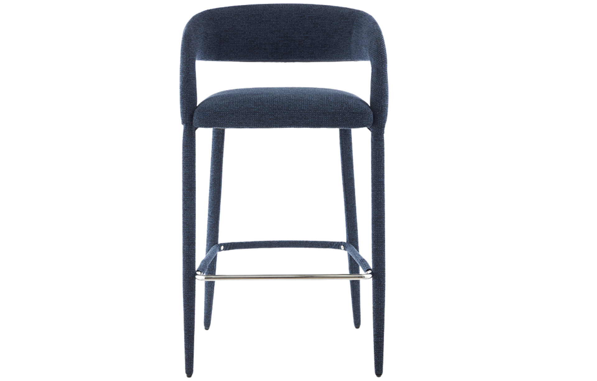 Banqueta Legua estofada em tecido com base revestida em tecido e apoia pés cromado.