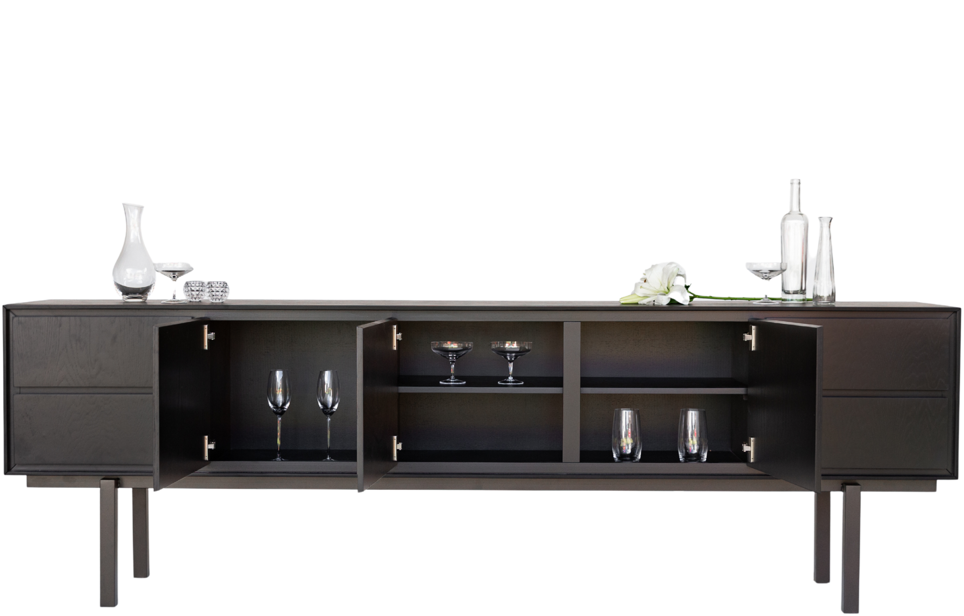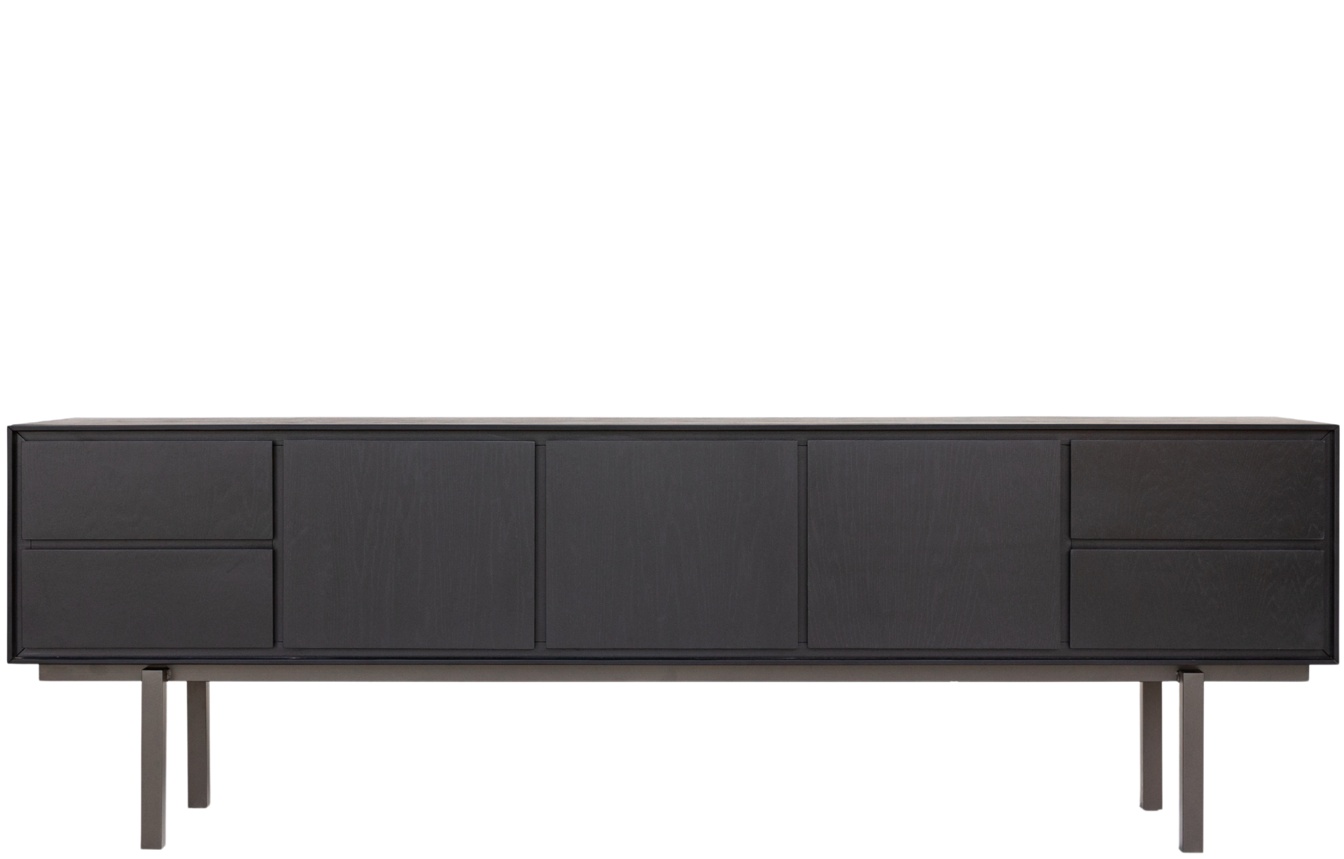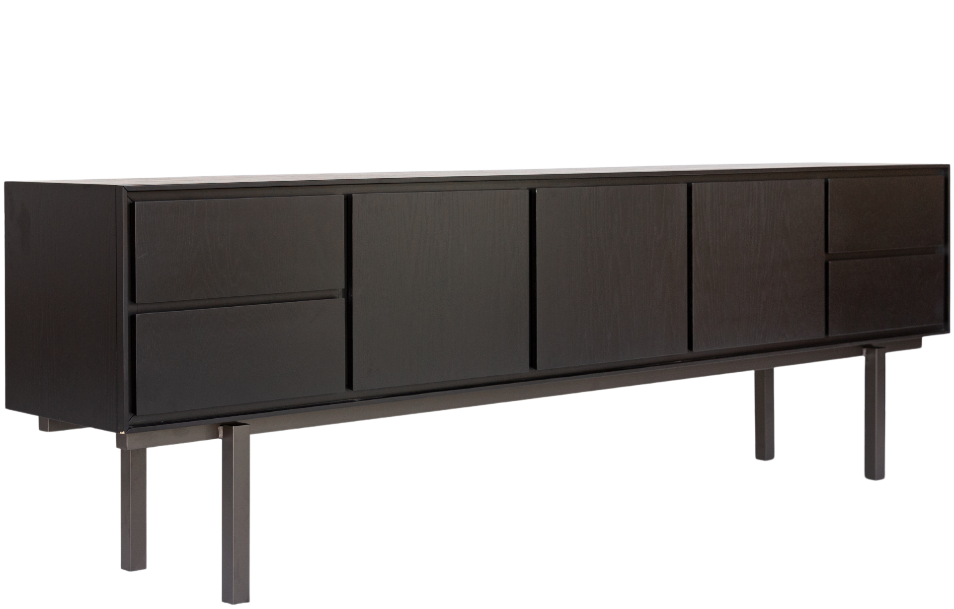 Buffet/Rack Cocal com estrutura em madeira maciça, possui quatro portas e duas gavetas, oferecendo amplo espaço de armazenamento. Seu design minimalista e as pernas de metal alongadas conferem uma estética contemporânea, ideal para salas de jantar ou estar.