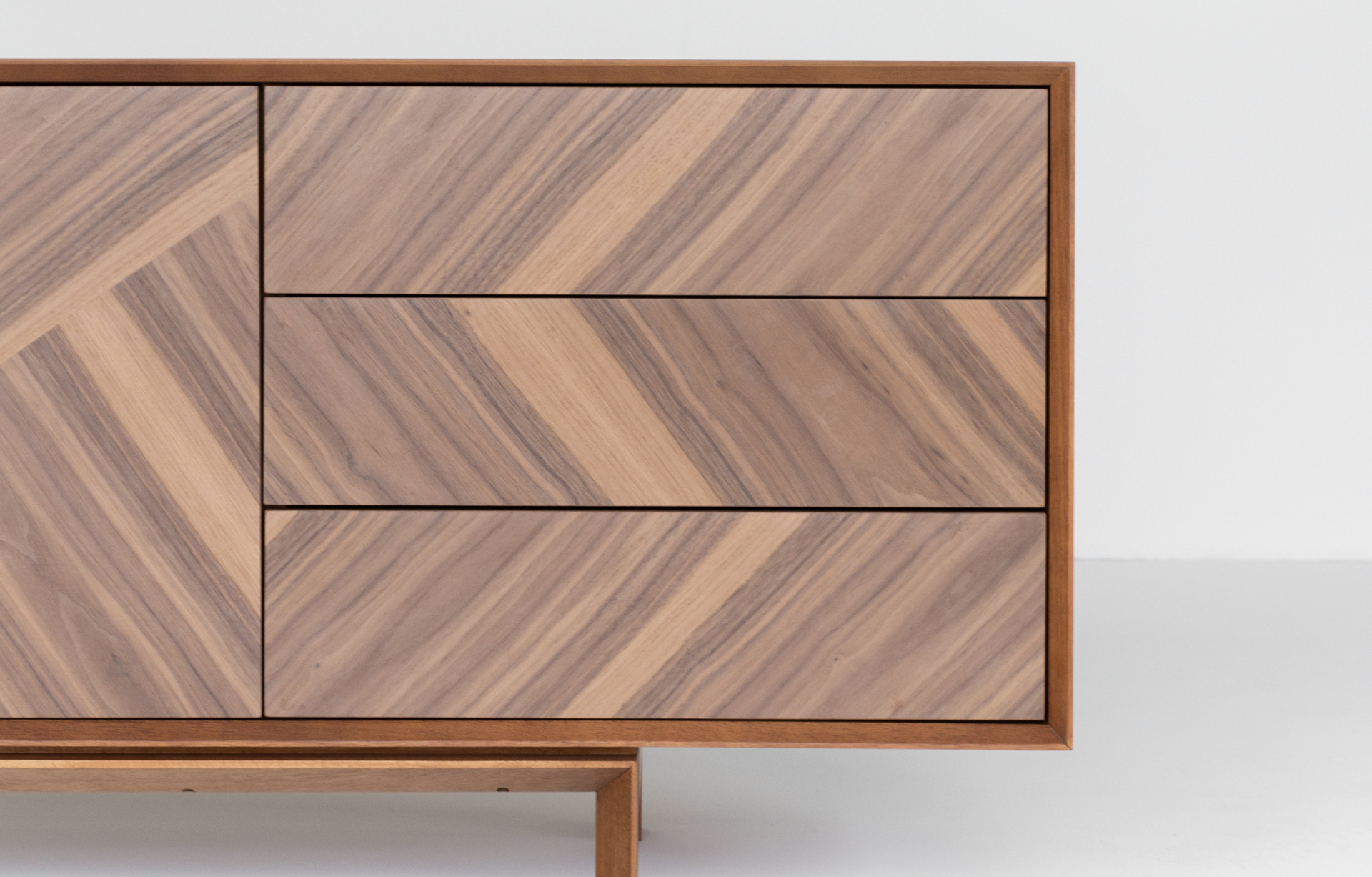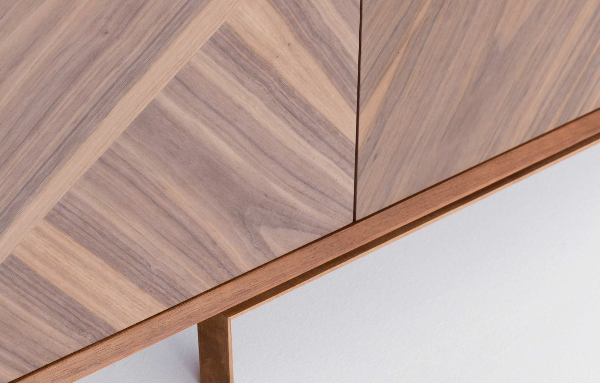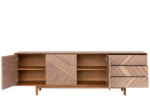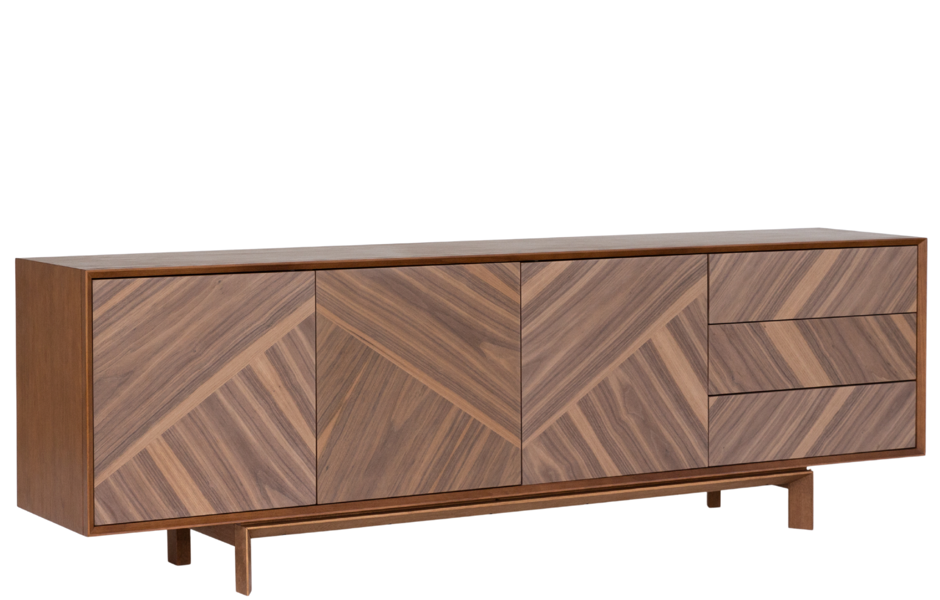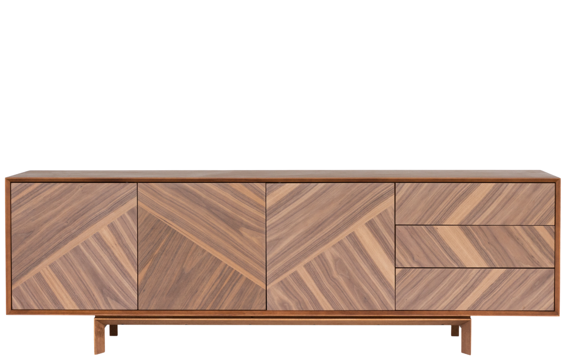 O Buffet Win se destaca pelo seu design contemporâneo e sofisticado, com um padrão de veios de madeira em diagonal que formam um desenho geométrico único nas portas e nas gavetas. A estrutura é elevada por pés discretos e uma base em metal, conferindo leveza e modernidade ao móvel. A combinação de portas e gavetas oferece soluções de armazenamento versáteis.