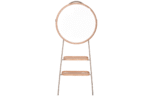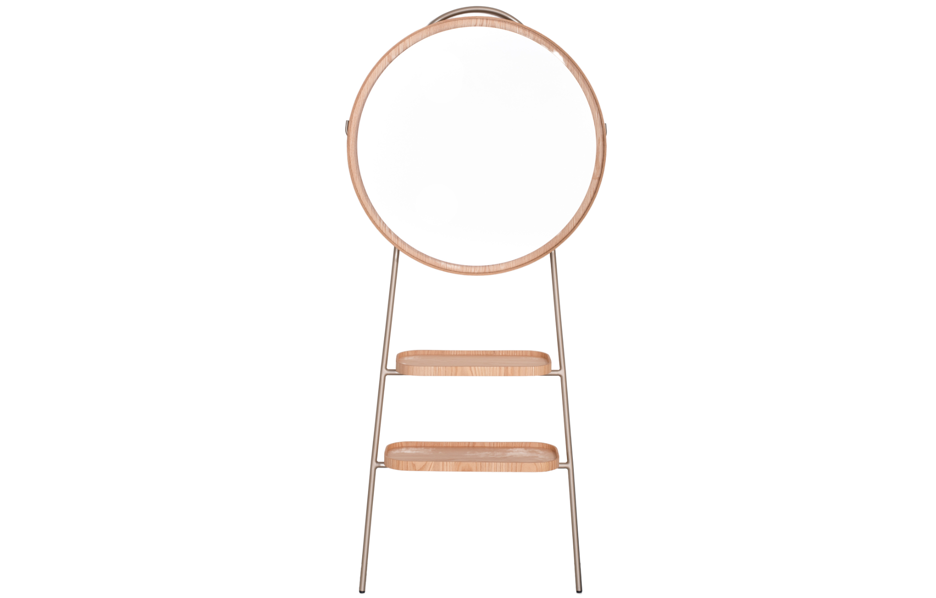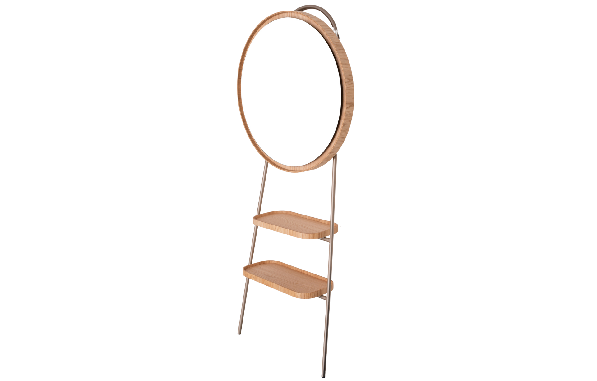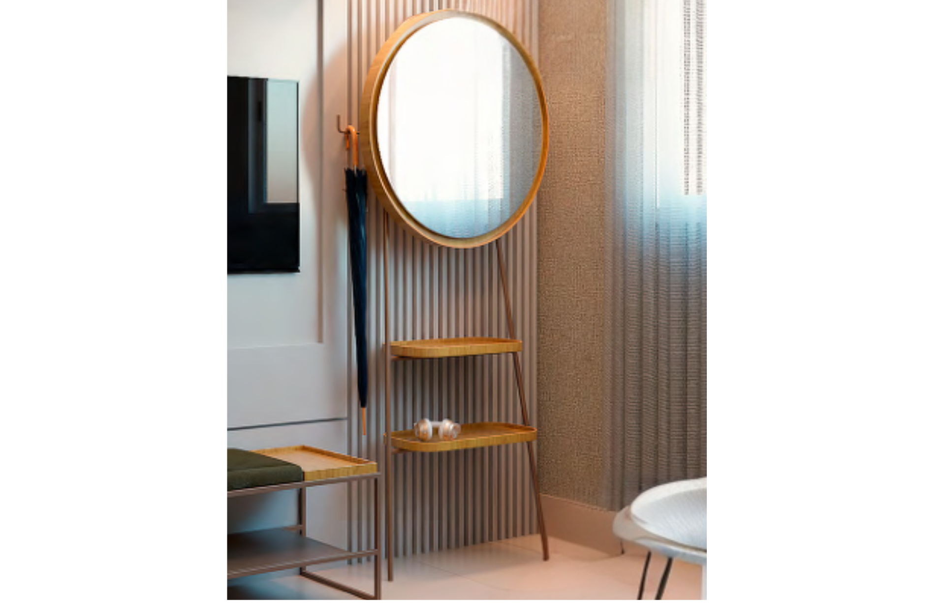 Cabideiro Santiago com espelho prata de ⌀= 75cm e moldura em madeira natural laminada. Com 2 bandejas organizadores em MDF laminado e estrutura em aço carbono pintado, unindo funcionalidade e elegância.