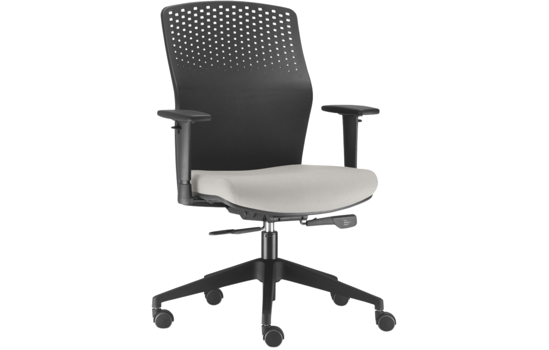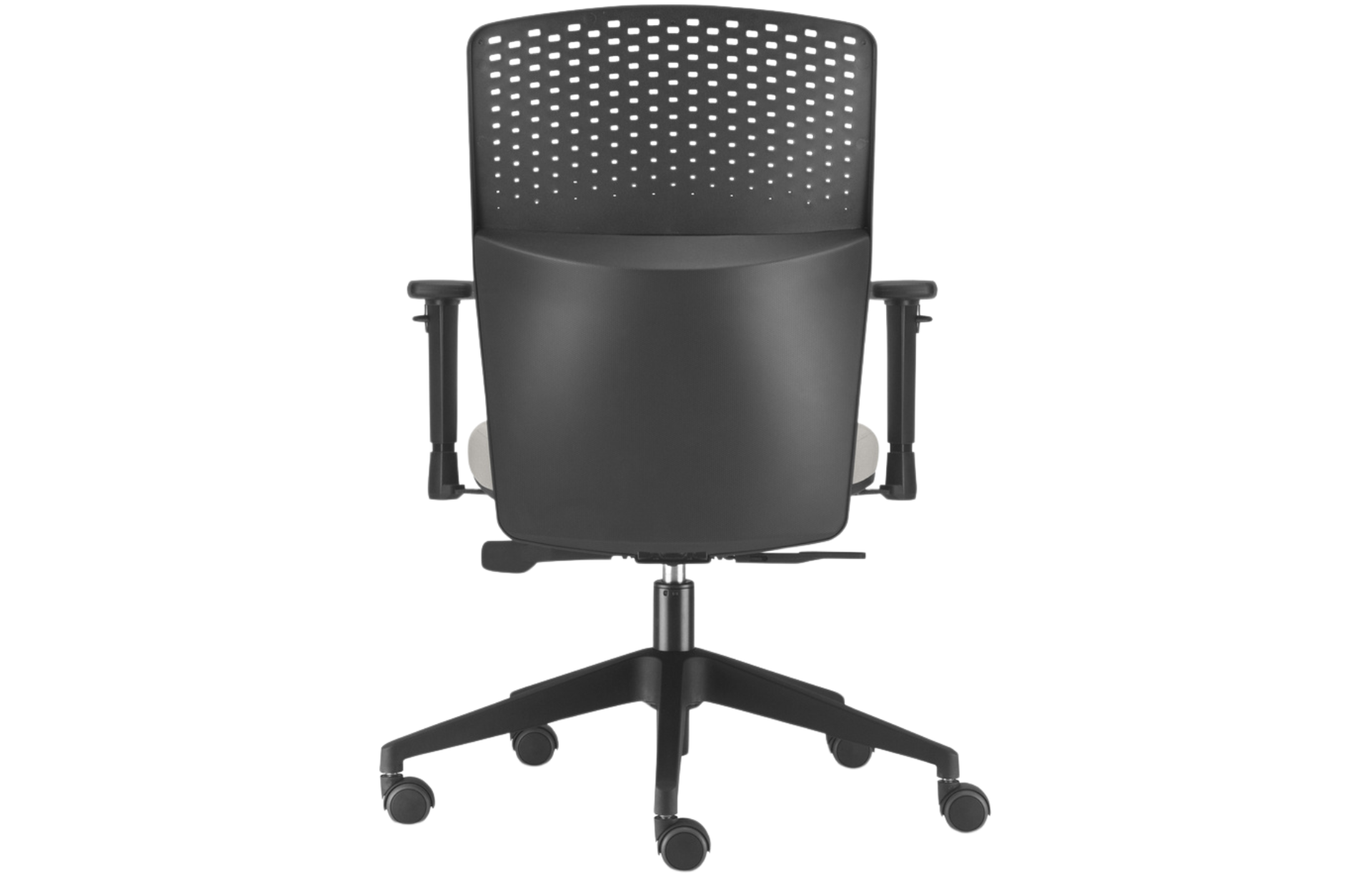 Encosto em polímero injetado, em diversas cores, com regulagem de altura, este encosto possui pequenos respiradores circulares permeando o espaldar, atende a um design único e permite a perspiração do usuário, possuí uma curvatura lombar que permite maior conforto.