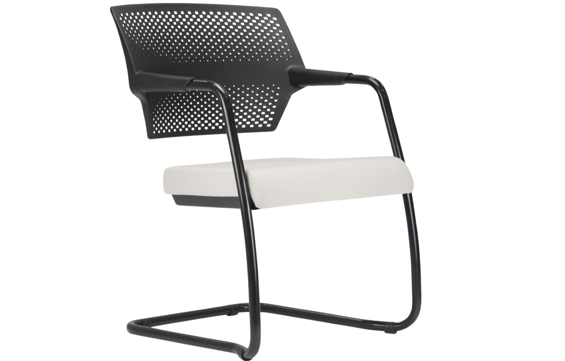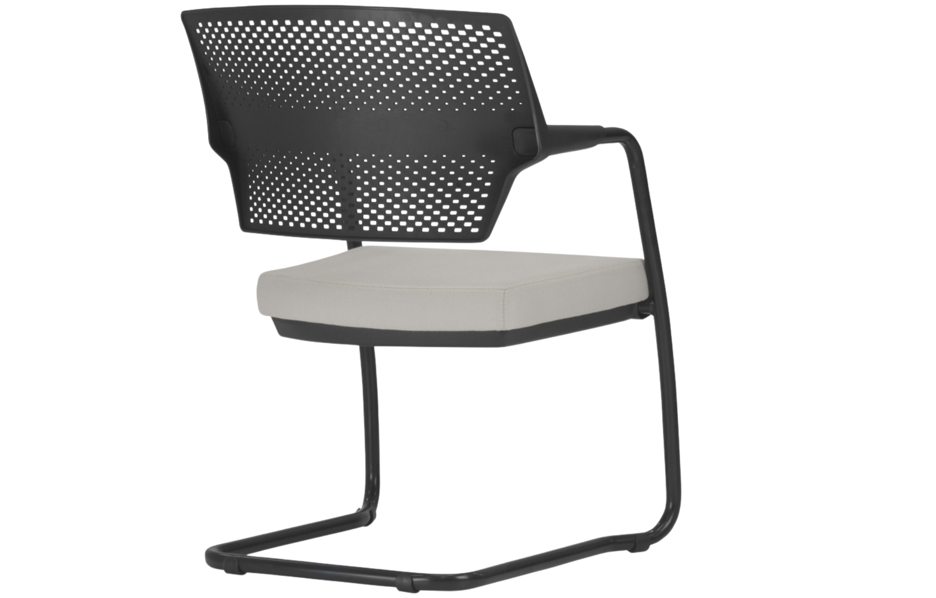 Encosto em polímero injetado, este encosto possui pequenos respiradores circulares permeando o espaldar, atende a um design único e permite a perspiração do usuário, possuí curvatura lombar que permite maior conforto.