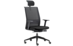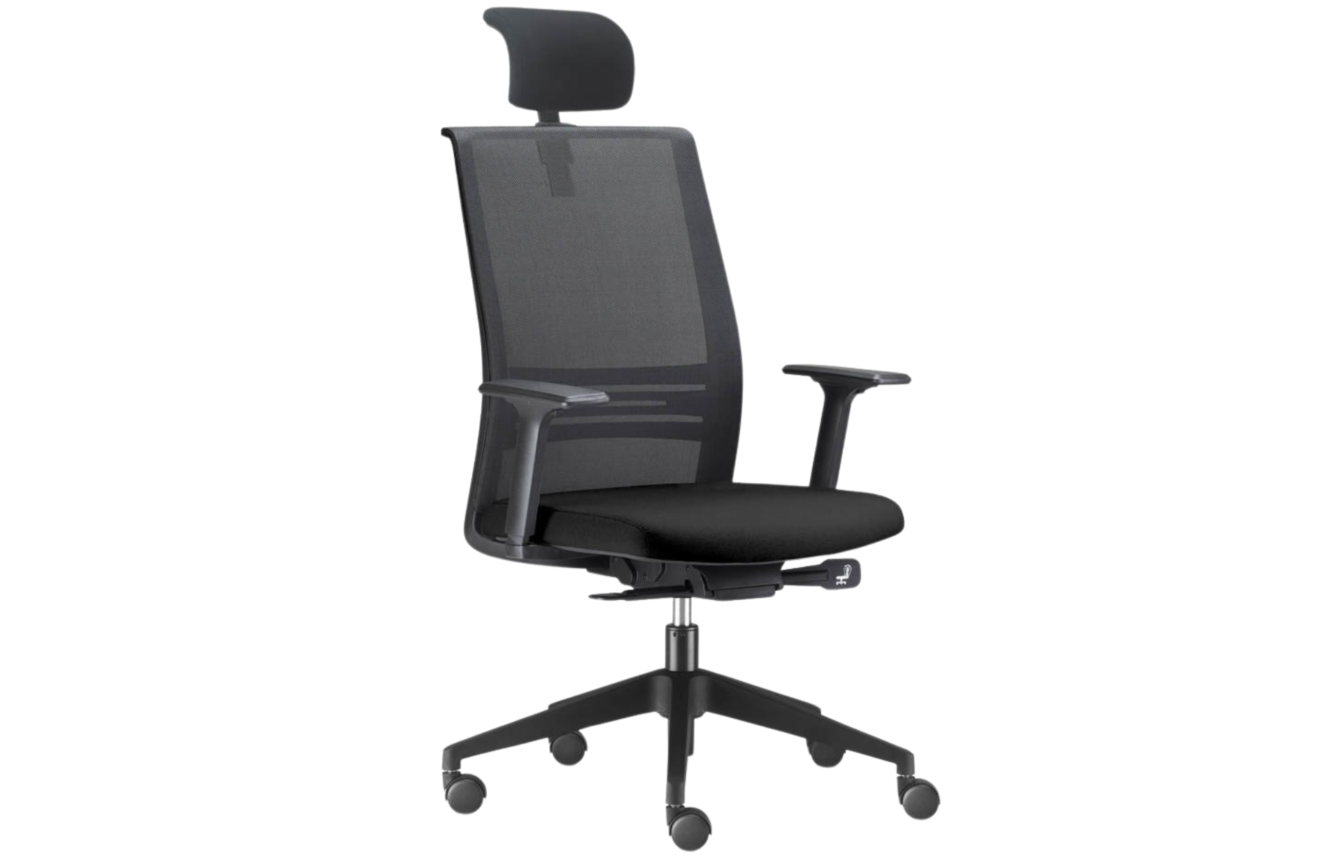 Cadeira Ágil Tela Presidente com encosto de cabeça, mecanismo que permite o movimento do conjunto assento de forma sincronizada, com travamento em 4 pontos, tensão auto ajustável. Braços e altura reguláveis. Rodízio anti risco.