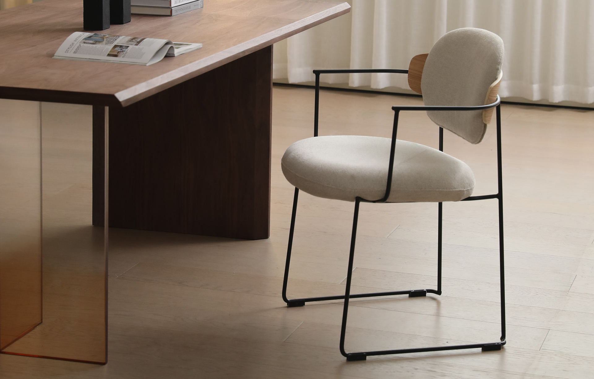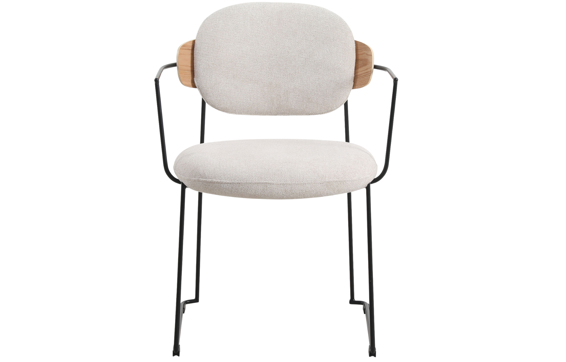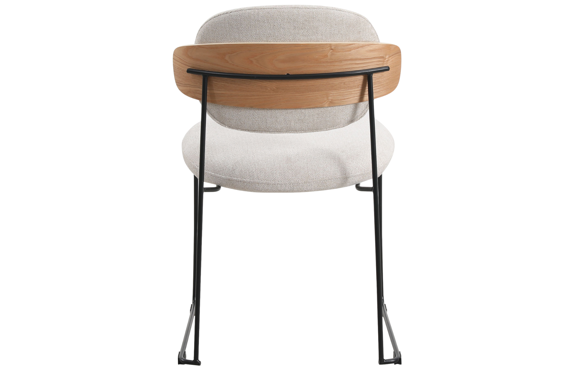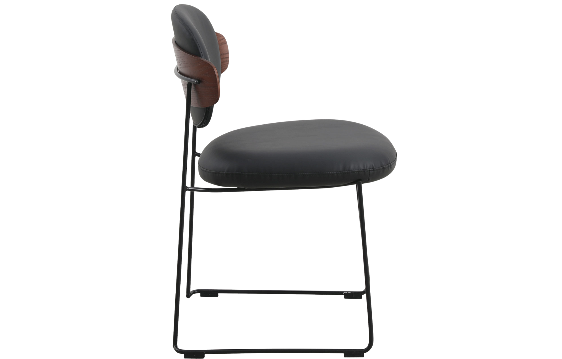 Cadeira Downtown, estofada em poliuretano ou tecido com detalhe de madeira multilaminada no encosto. Base em aço pintado à pó.