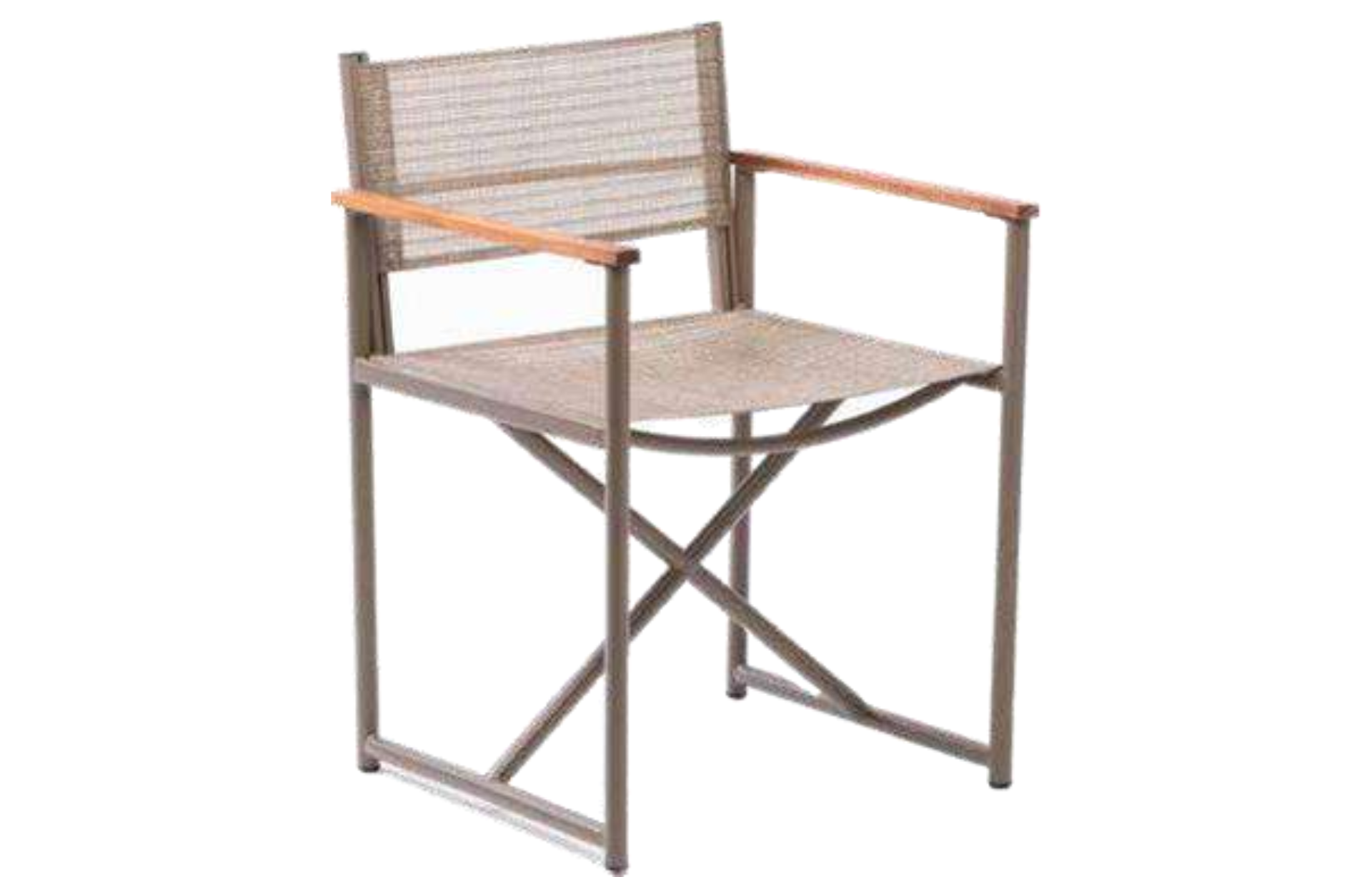 Cadeira Jocasta com encosto em Alumínio, assento e encosto em Tela Sling e detalhe de Madeira nos braços.