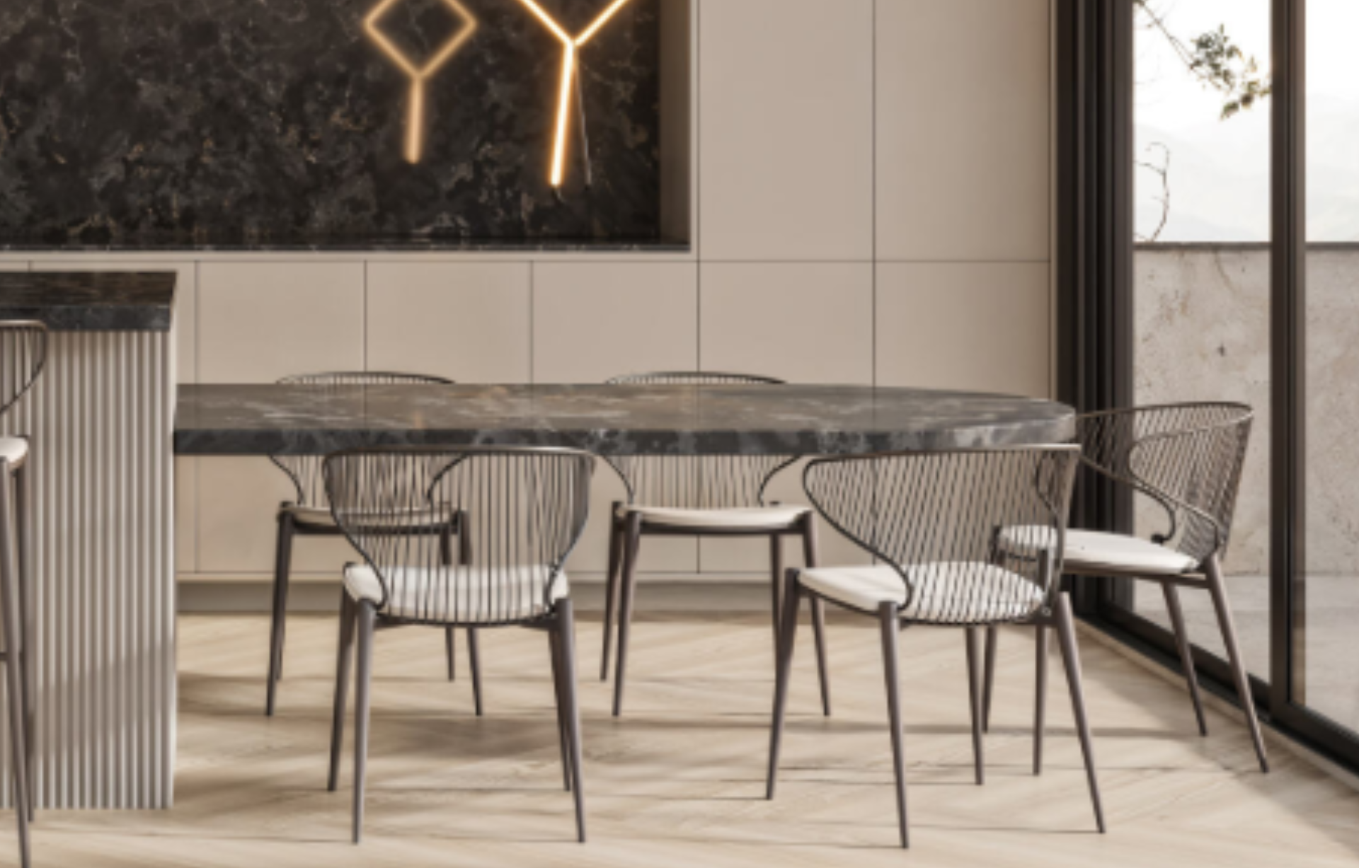 Cadeira Lynch revestida em PU com estrutura de madeira compensada e pernas em metal