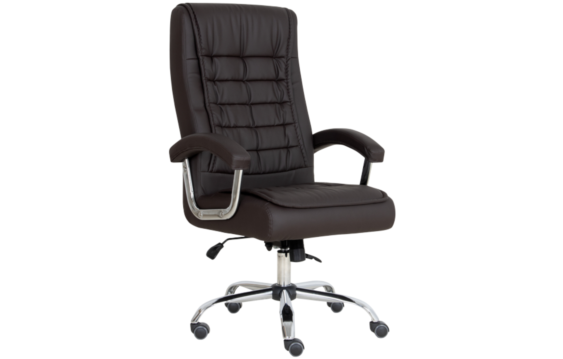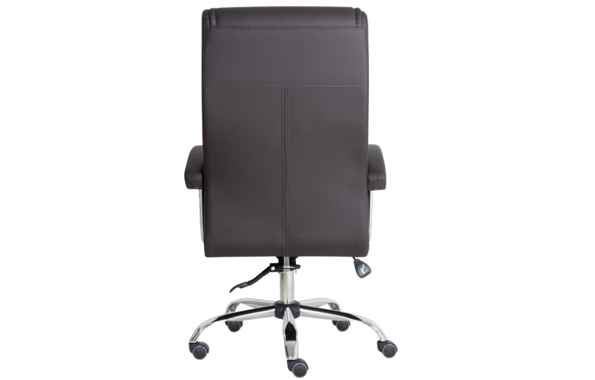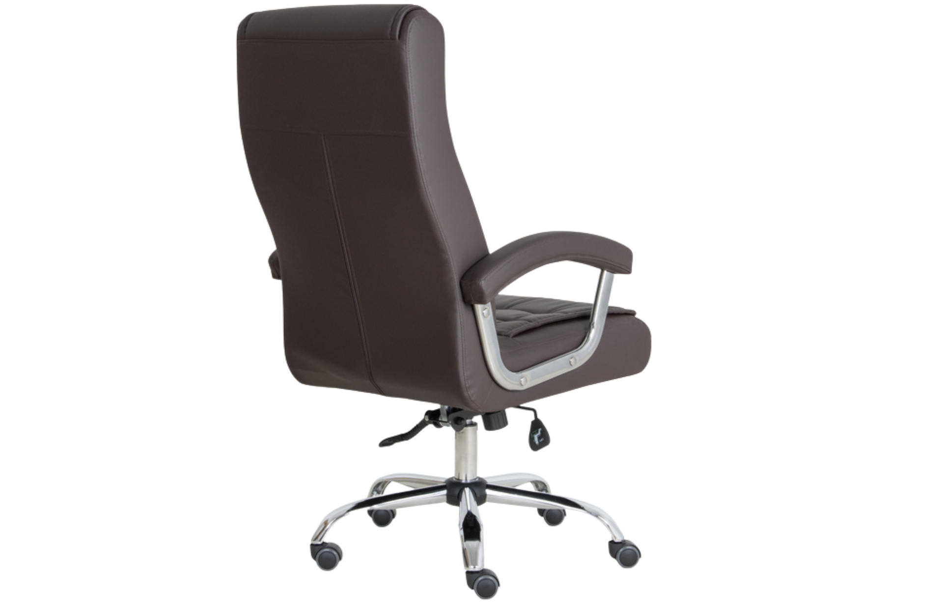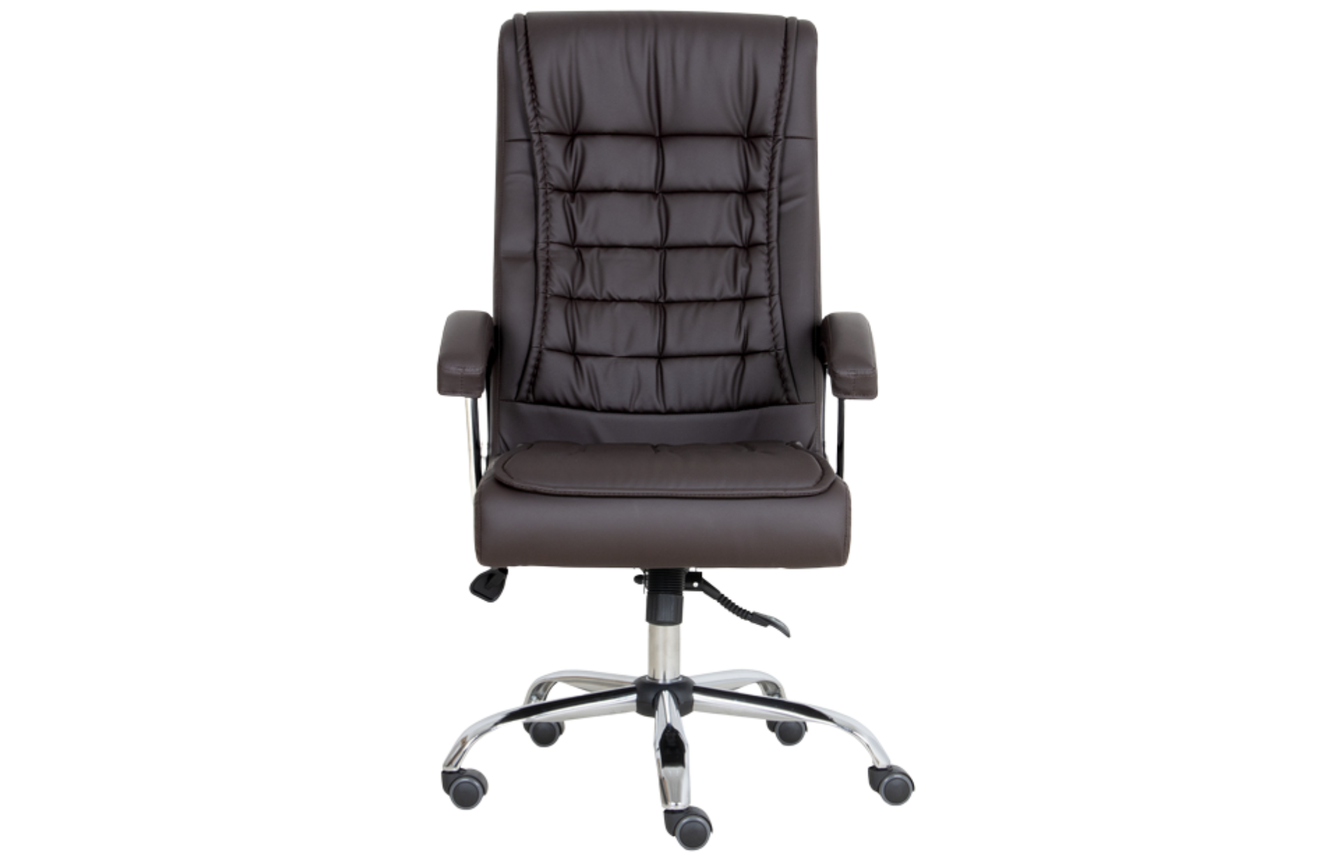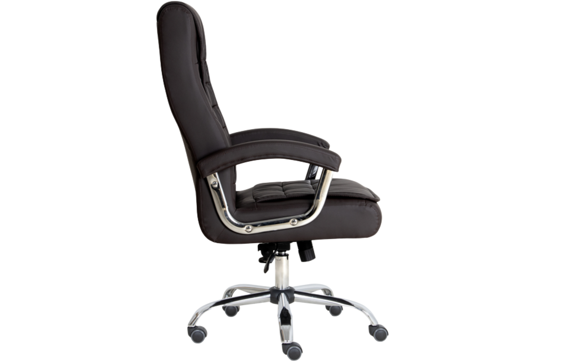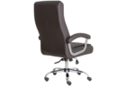 Poltrona giratória, espaldar alto, padrão presidente, com espumas de assento e encosto independentes, porém estruturadas em chassi de assento e encosto de formato monobloco, sendo a concha de compensado em formato monobloco. Assento e encosto estruturado em compensado multilaminado de no mínimo 15 mm de espessura. Tal estrutural é provido de furação para acoplamento da estrutura (base), na porção do assento, com medida de furos de 160 x 200 mm. Por meio de adesivo de contato ao estrutural supra especificado, são fixadas duas almofadas independentes para assento e para encosto de espuma com molas ensacadas, com alta densidade e dimensões mínimas do assento: largura de superfície de 500 mm x 460 mm de profundidade da superfície e 60 mm de espessura, dimensões mínimas do encosto de largura 500 mm x 560 mm extensão vertical total e 60 mm de espessura da espuma. Acabamento de assento e encosto, além do revestimento, com utilização de manta de espuma laminada, entre a espuma injetada e o revestimento, de modo a aferir a estética desejada, recobrindo todo o monobloco de assento e encosto, com acabamento através da utilização de costuras horizontais. Material de revestimento em laminado sintético, popularmente conhecido como couro ecológico. Mecanismo para reclinação de assento e encosto do tipo relax, permitindo travamento na posição inicial e movimento de livre flutuação, com tensão da mola ajustada por manípulo localizado sob o assento, na parte frontal. Acionamento do pistão a gás e do sistema de reclinação através da mesma alavanca. Classificação de qualidade e durabilidade do pistão em consonância com o nível 03 da Norma Internacional EN DIN 16955:2017. Base de cinco patas em tubo de aço, com acabamento cromado, de formato arcado com rodízio de duplo giro de cor preta com banda de rodagem de PU sem a utilização de buchas plásticas com diâmetro de roda de no mínimo 49 mm. Par de braços fixos, com acabamento cromado e apoio revestido pelo mesmo material de revestimento do assento e encosto, ancorados ao assento e ao encosto, unindo-os e, portanto, auxiliando na resistência estrutural do monobloco.