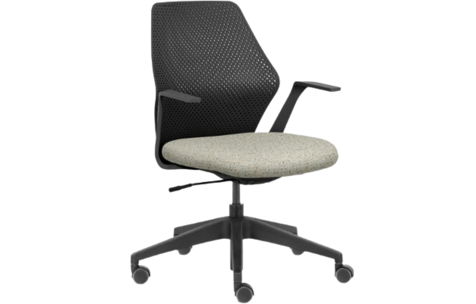 Braço fixo, faz harmonia com o desenho estruturado do encosto.