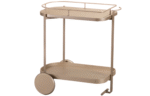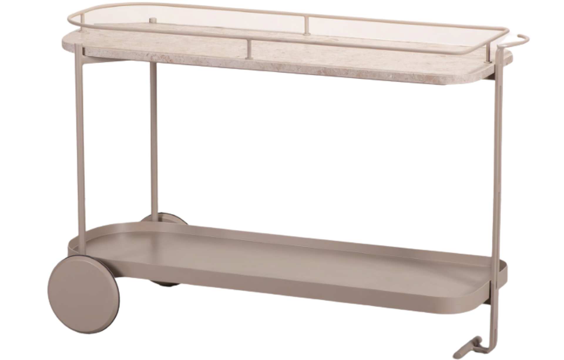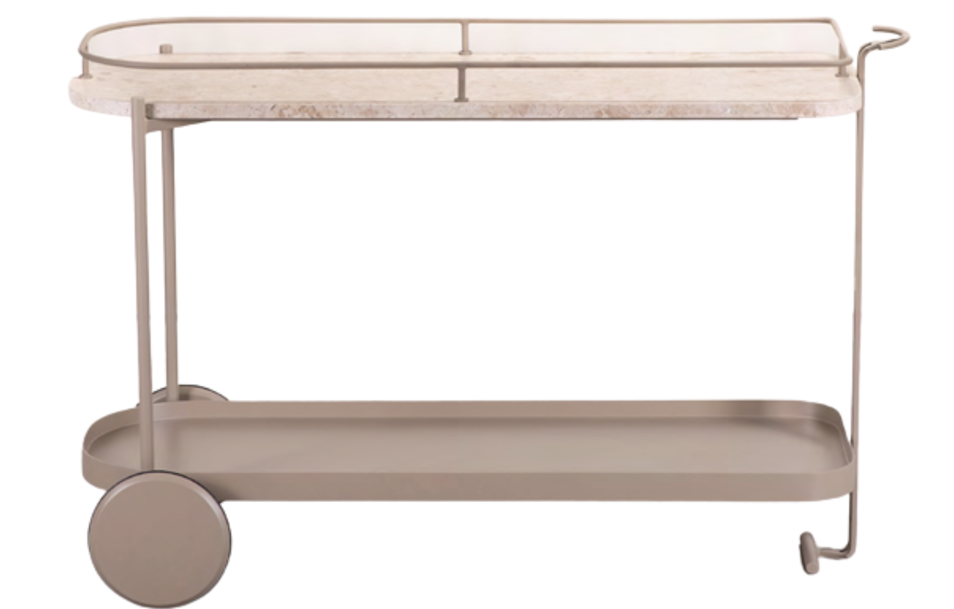 Carro bar Navena com a 1° bandeja disponível em lamina, laca, mármore ou TS. Estrutura em aço carbono pintado e pegador com trama de couro natural nas opções preto, caramelo ou fendi.