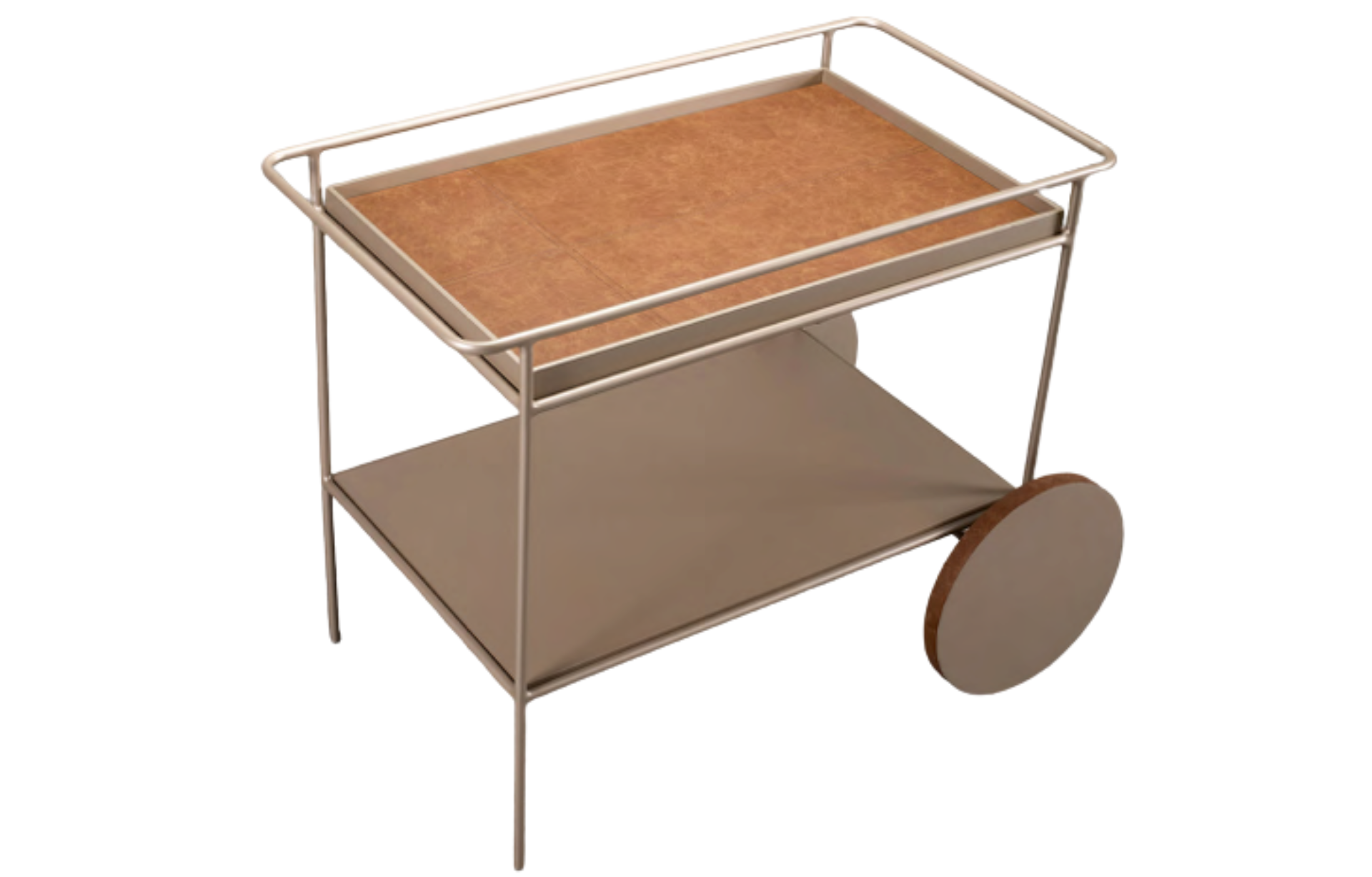 Carro bar Oster com bandeja superior com borda em pintura laca e fundo em recouro. Tampo inferior em pintura laca. Estrutura em aço carbono pintado com rodas detalhes da roda em recouro no mesmo padrão da bandeja superior.