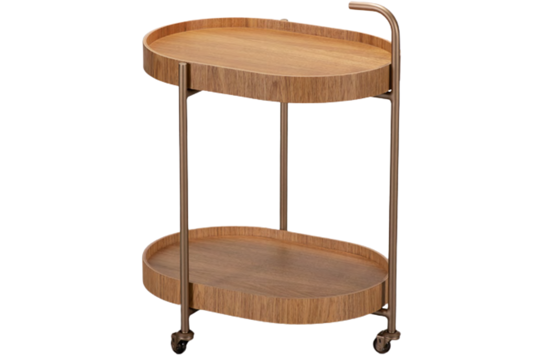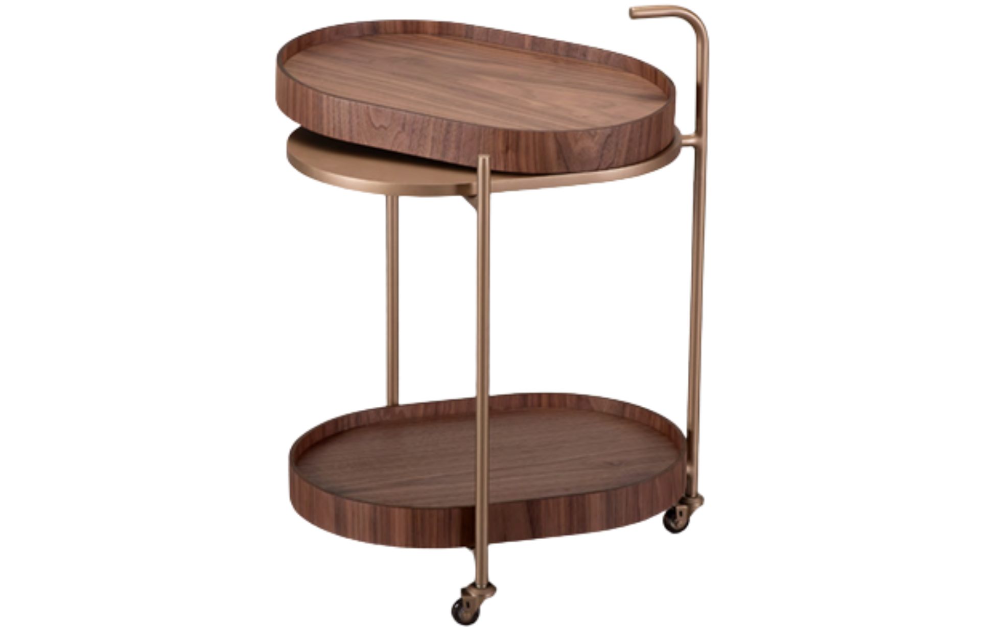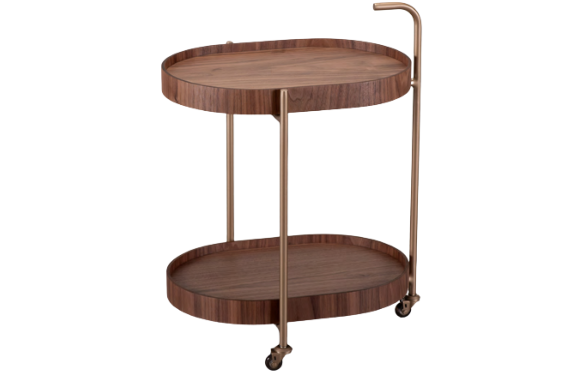 Carro bar Yanki com bandeja removível, disponível em lâmina de madeira ou pintura laca que realça os veios naturais da madeira. Estrutura em aço carbono, design funcional e elegante.