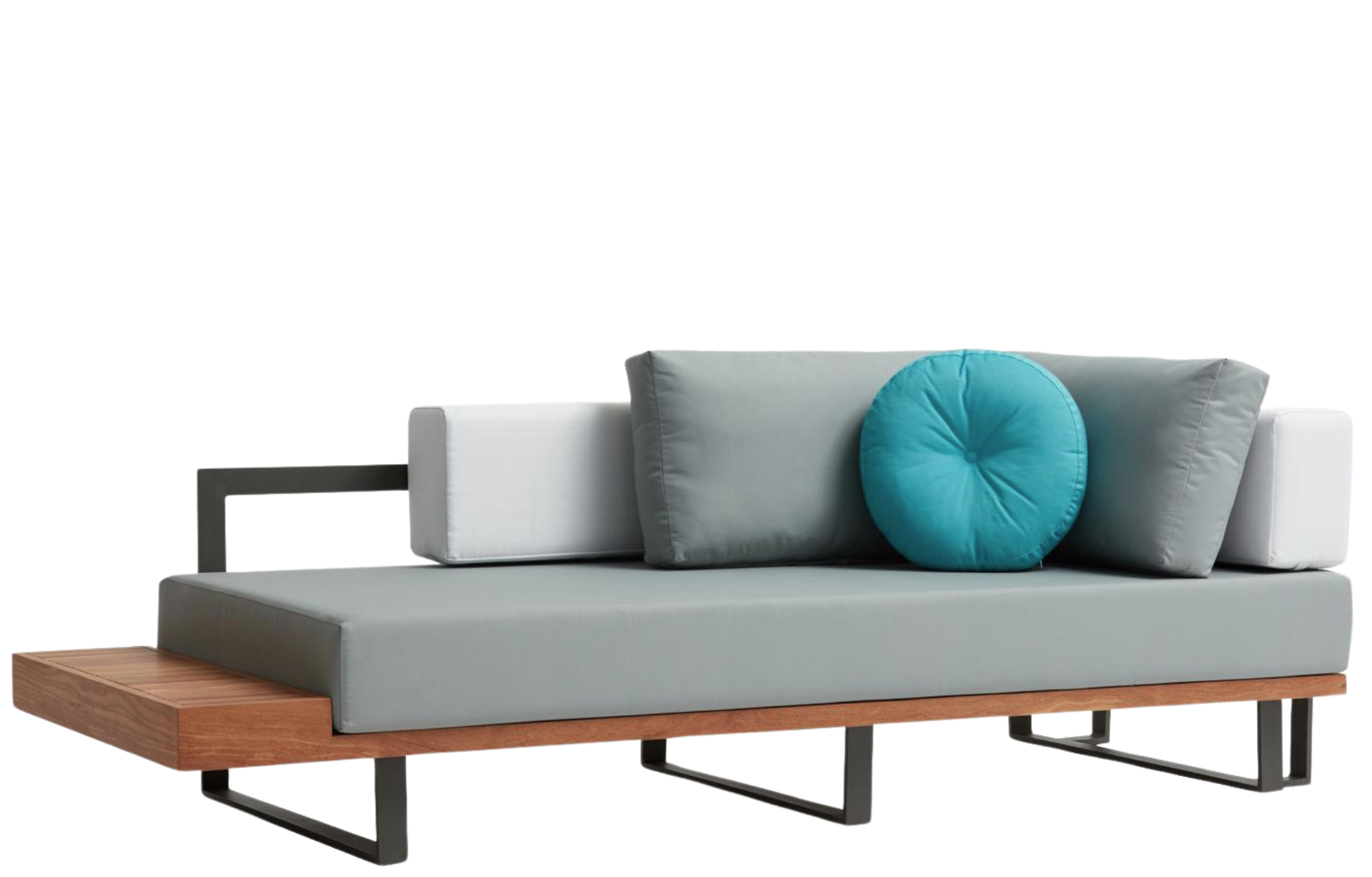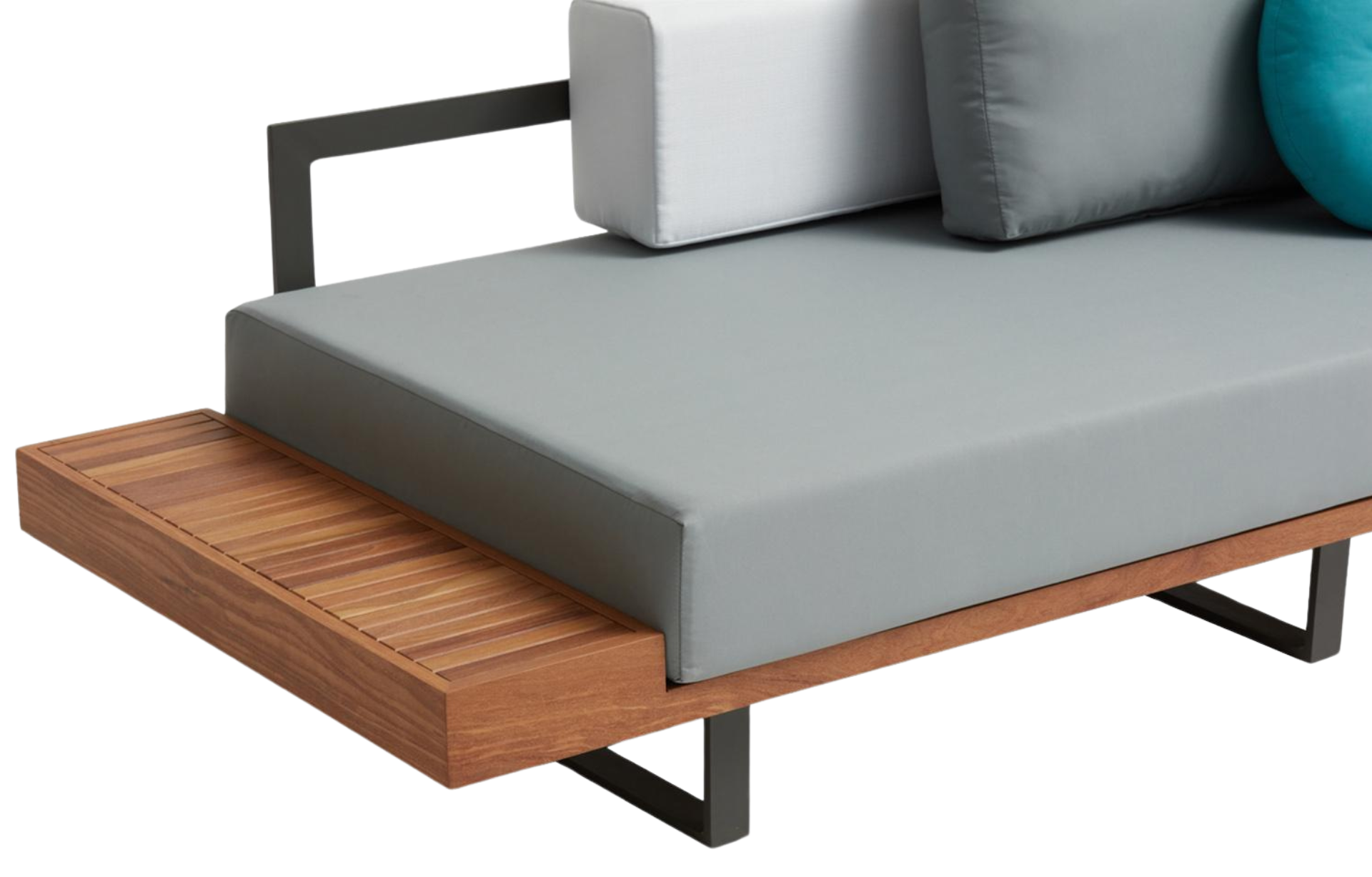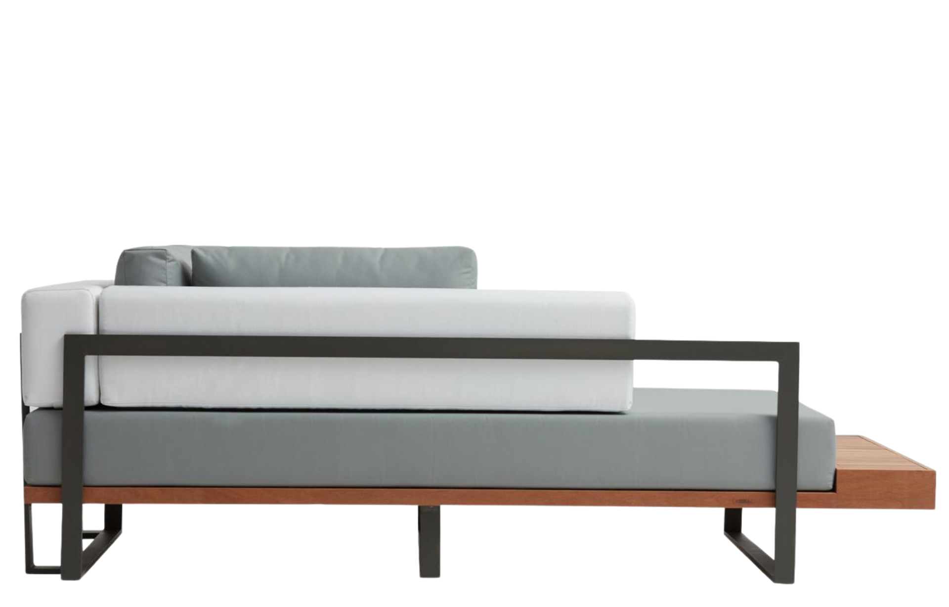 Chaise contemporânea, desenhada por Camila Forbeck, possui acabamento em madeira Cumaru, tecido e alumínio.