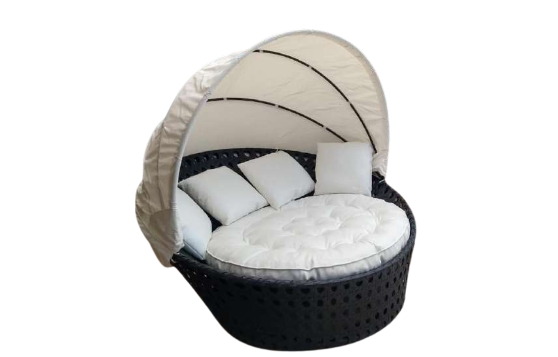 Chaise Pêssego com cobertura, estruturada em alumínio e fibra, estofamento nos assentos.