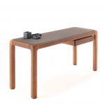 Pés e estrutura em madeira maciça certificada. Com processos de usinagem que garante a durabilidade do mobiliário. Disponível em freijó natural ou acabamentos tingidos. Tampo em MDF laminado, pintado, couro ou em pedra.