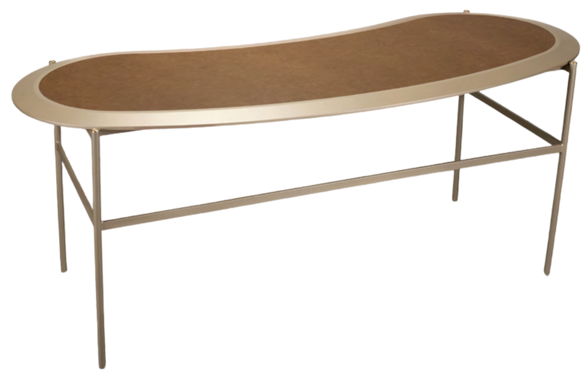 Escrivaninha Mix com tampo orgânico e bordas chanfradas para maior ergonomia. Opção de borda laminada ou pintura laca, com fundo em recouro. Estrutura em aço carbono pintado com ponteiras em latão.