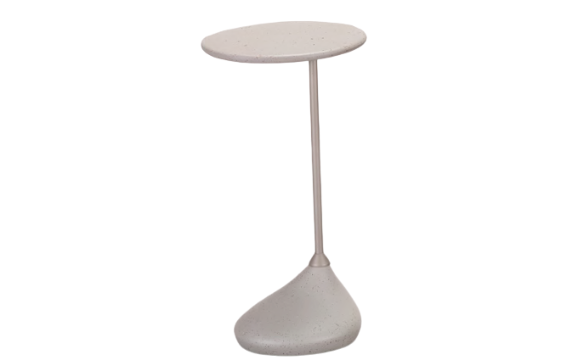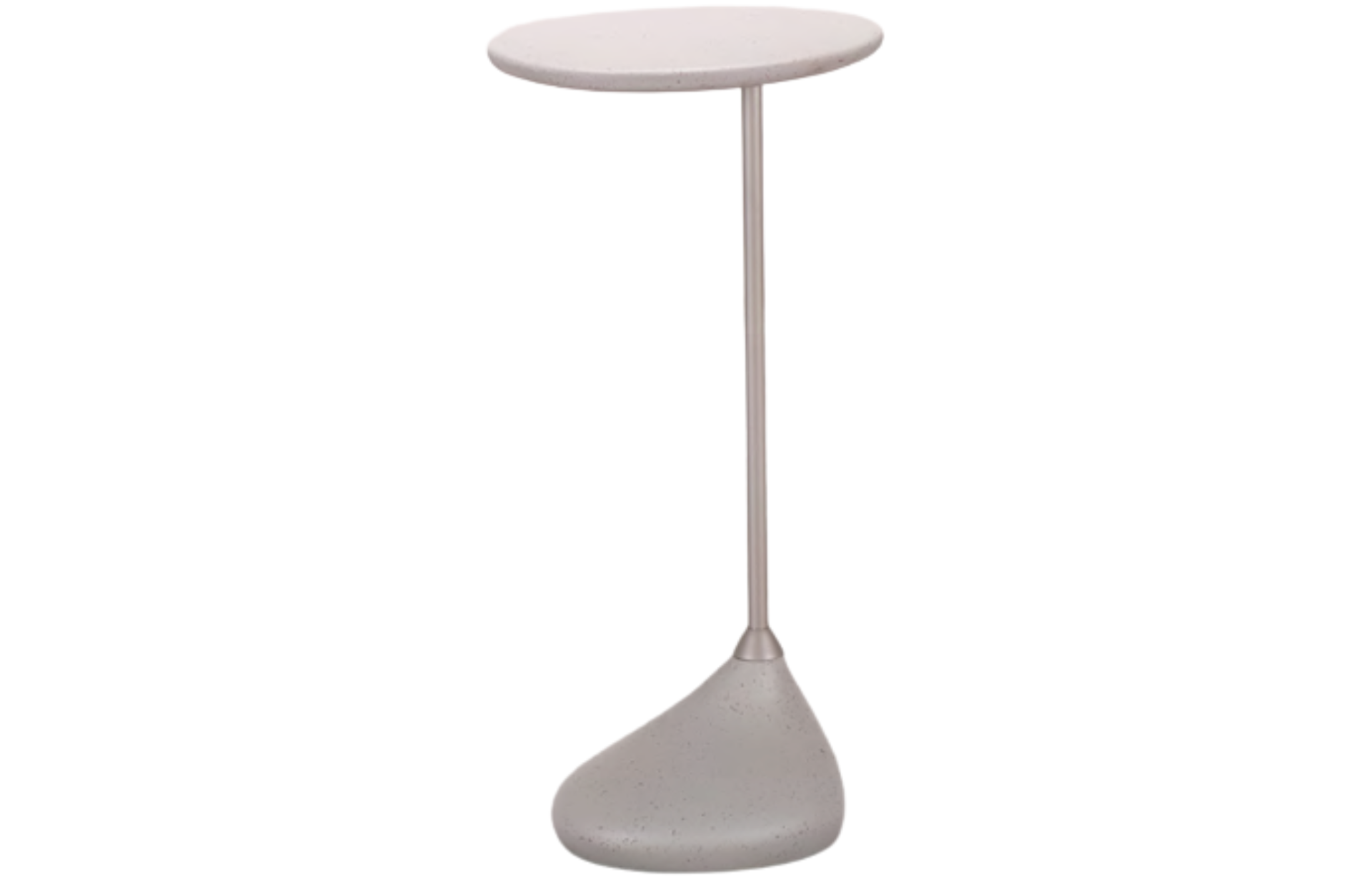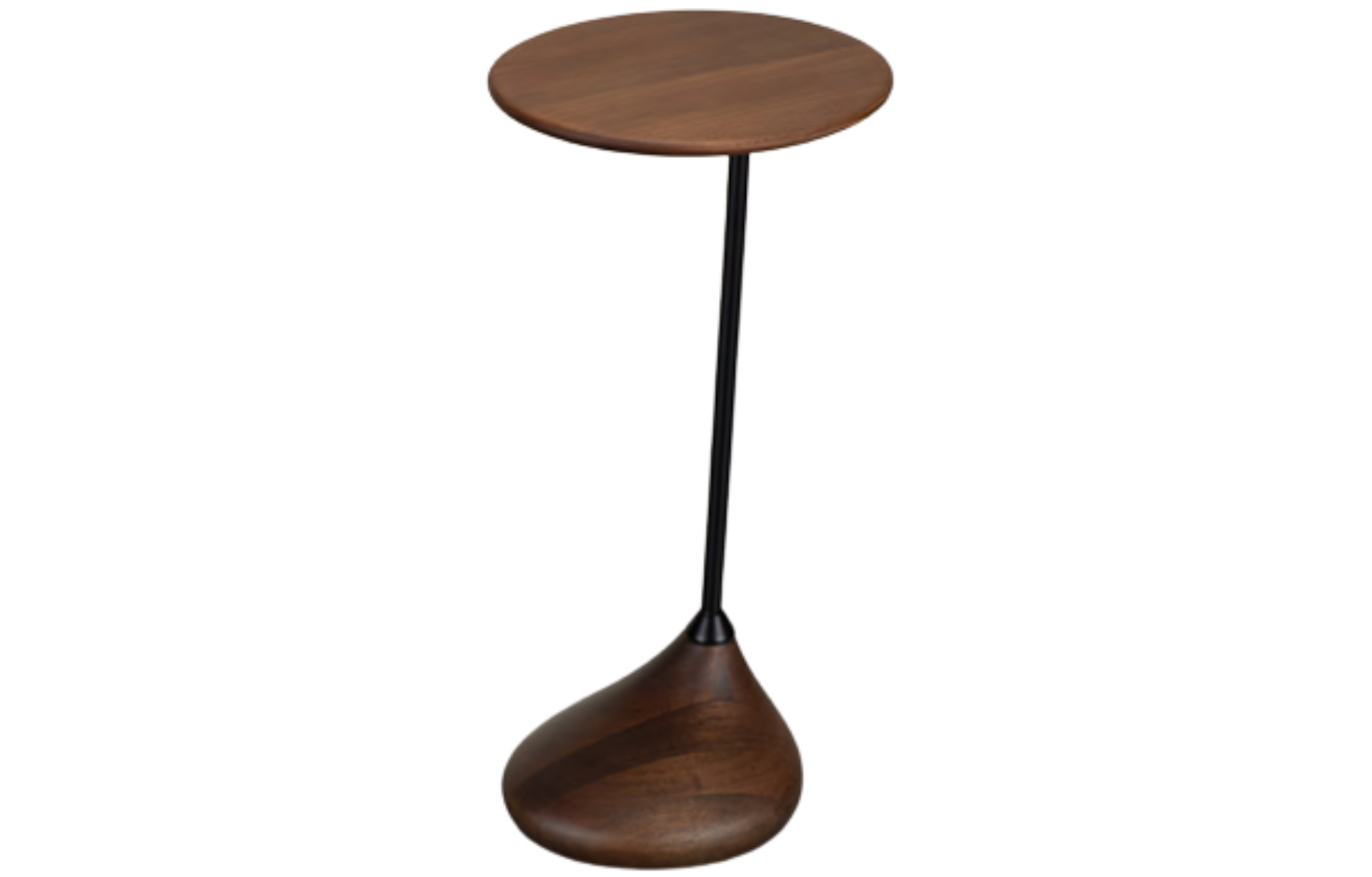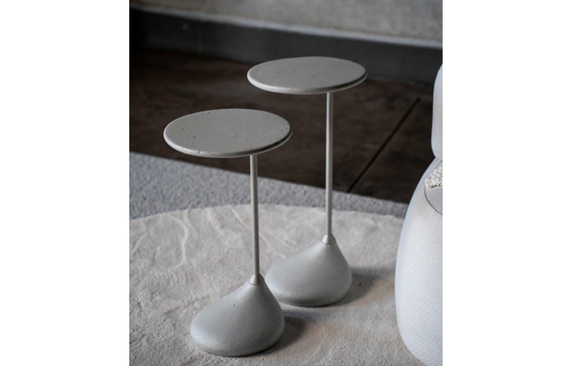 Mesa de Apoio Strata com tampo e base em madeira maciça nas opções natural, castanho ou ébano, ou cimento tcnológico, disponível em acabamento natural (concreto ou café). Haste em latão ou pintada.