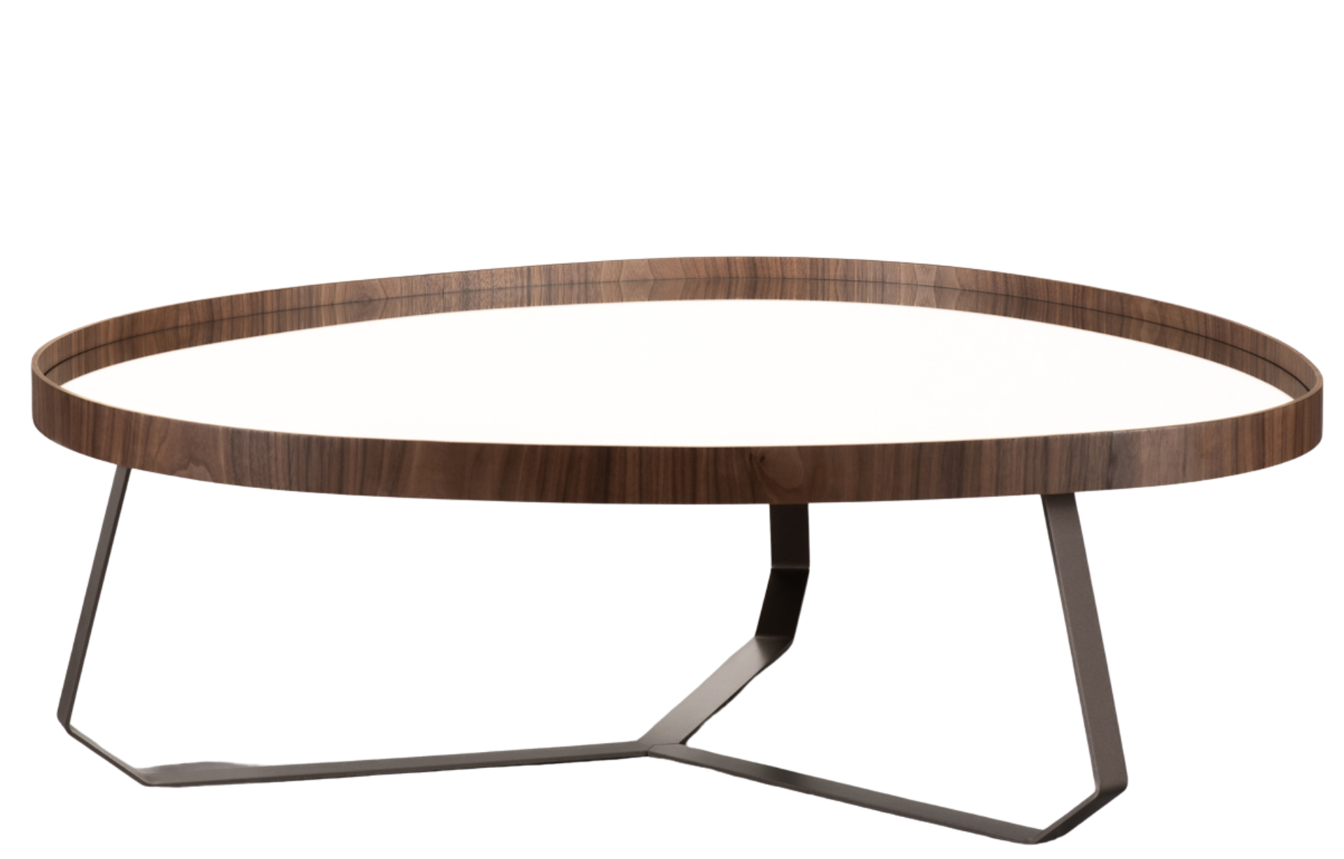 Mesa de Centro Cape tipo bandeja, com formato orgânico e borda laminada. Fundo em recouro ou espelho, e base em aço carbono pintado.