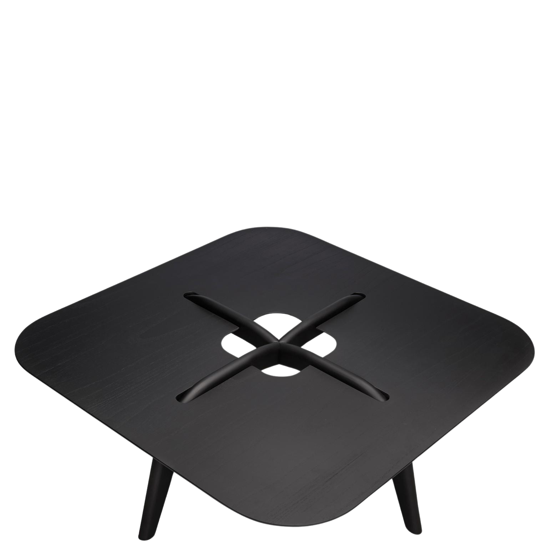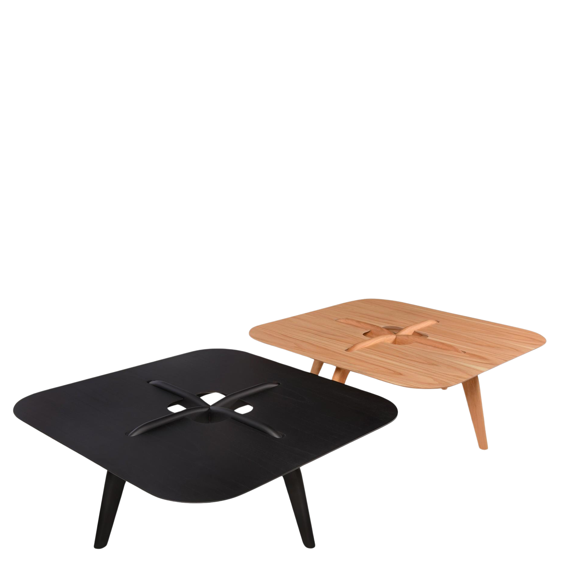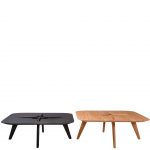 Delicadas e sutis, as mesas de centro são compactas e exploram o universo dos alinhavos em duas cores distintas. A madeira dos pés, é tratada como um fio costurado no tampo, convergindo para o vão central que fica em evidência como um botão. O tampo de cantos arredondados parece estar em balanço sobre a estrutura, proporcionando uma sensação de leveza à peça