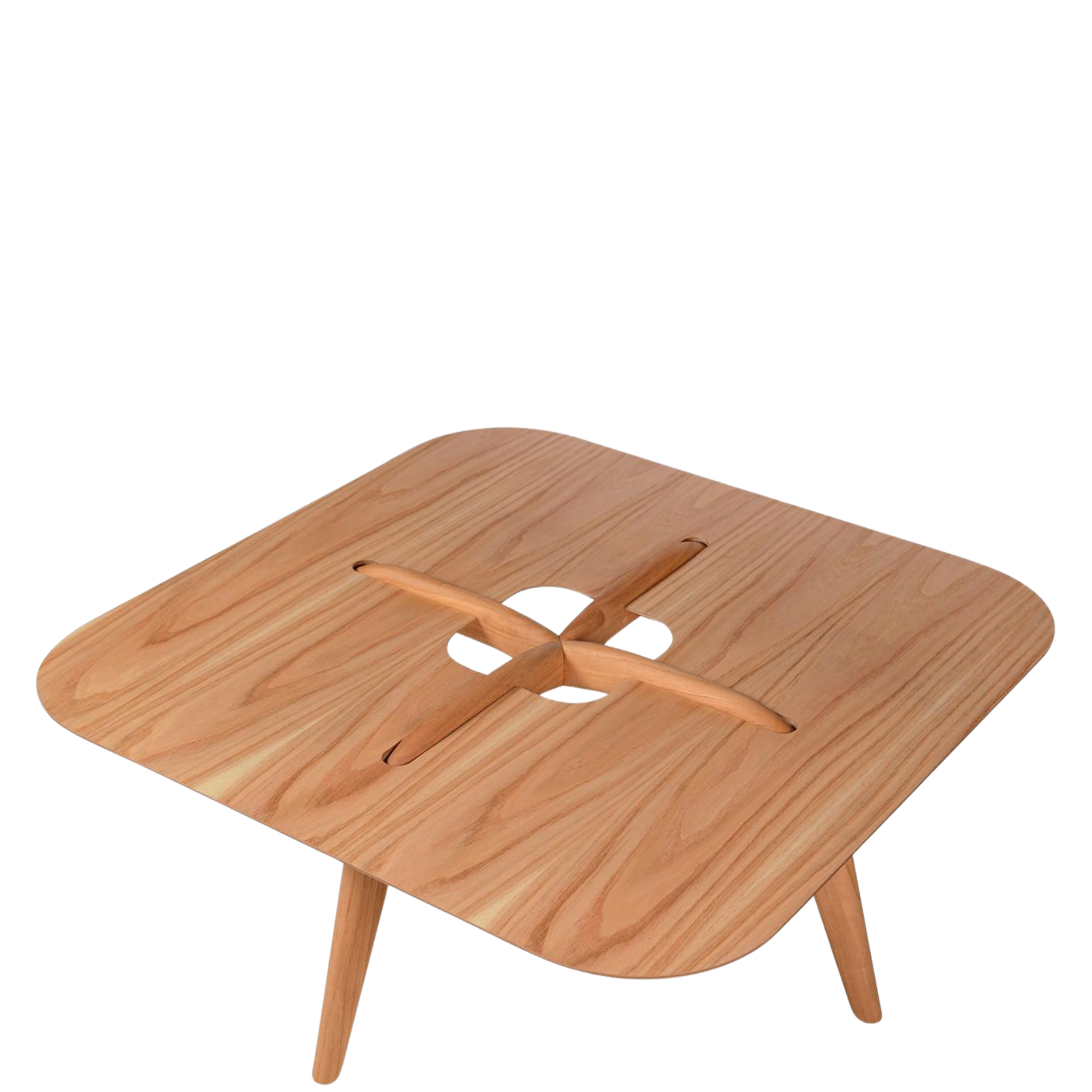 Com visual muito delicado, a mesa de centro explora o universo dos alinhavos. A madeira dos pés é tratada como um fio costurado no tampo, convergindo para o vão central que fica em evidência como um botão. O tampo de cantos arredondados parece estar em balanço sobre a estrutura, proporcionando uma sensação de leveza à peça.