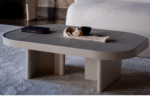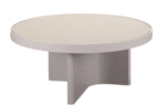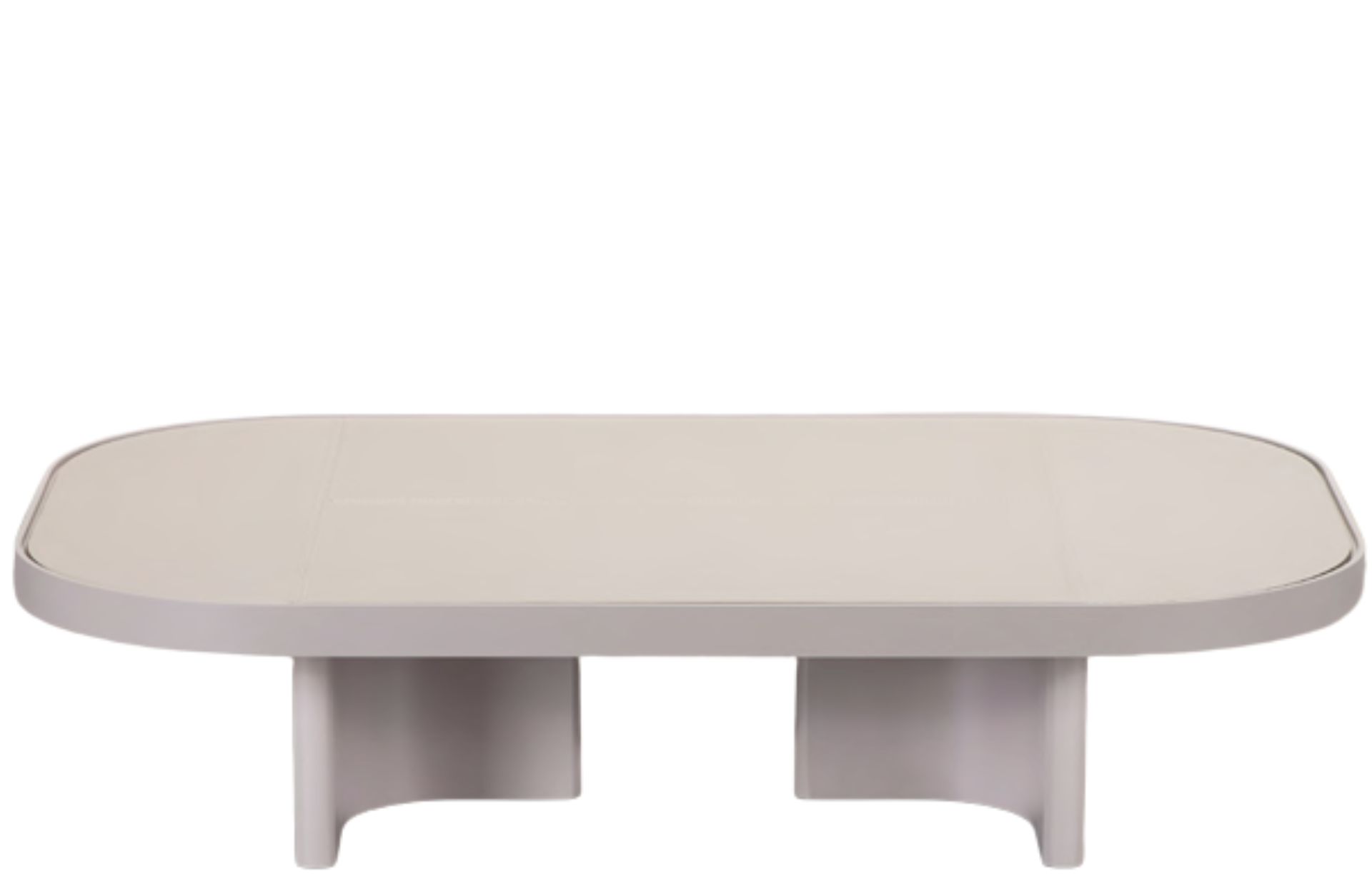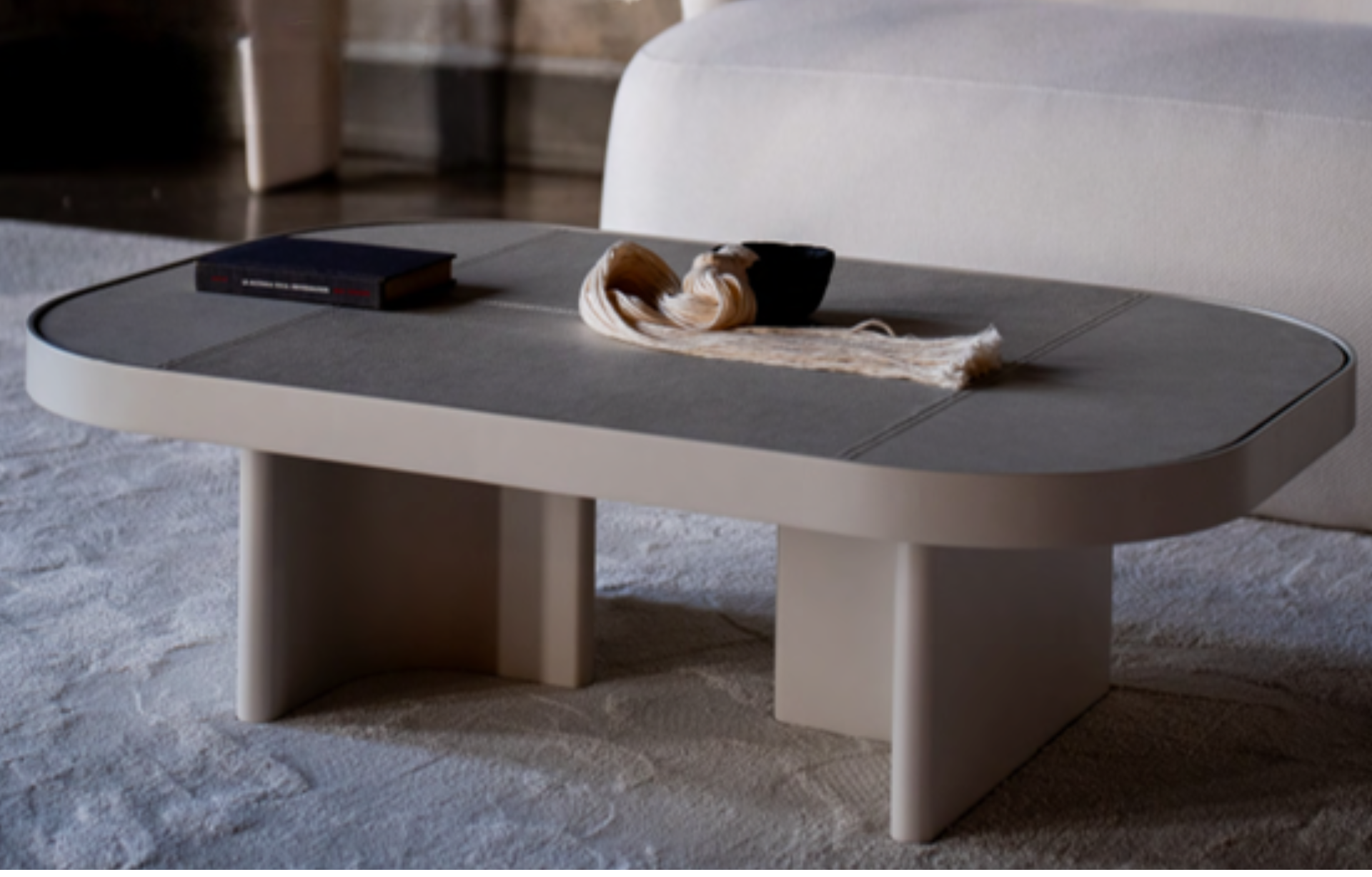 Mesa de Centro Flux com tampo retangular ou redondo com fundo em recouro. Base em laca ou laminada.
