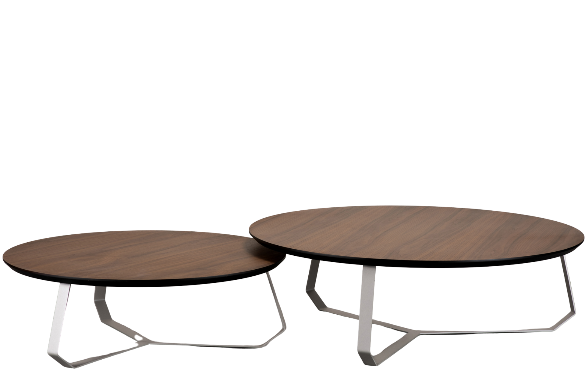 Mesa de Centro Gerona com tampo redondo em lâmina de madeira natural e estrutura em aço carbono cortado a laser com acabamento pintado.