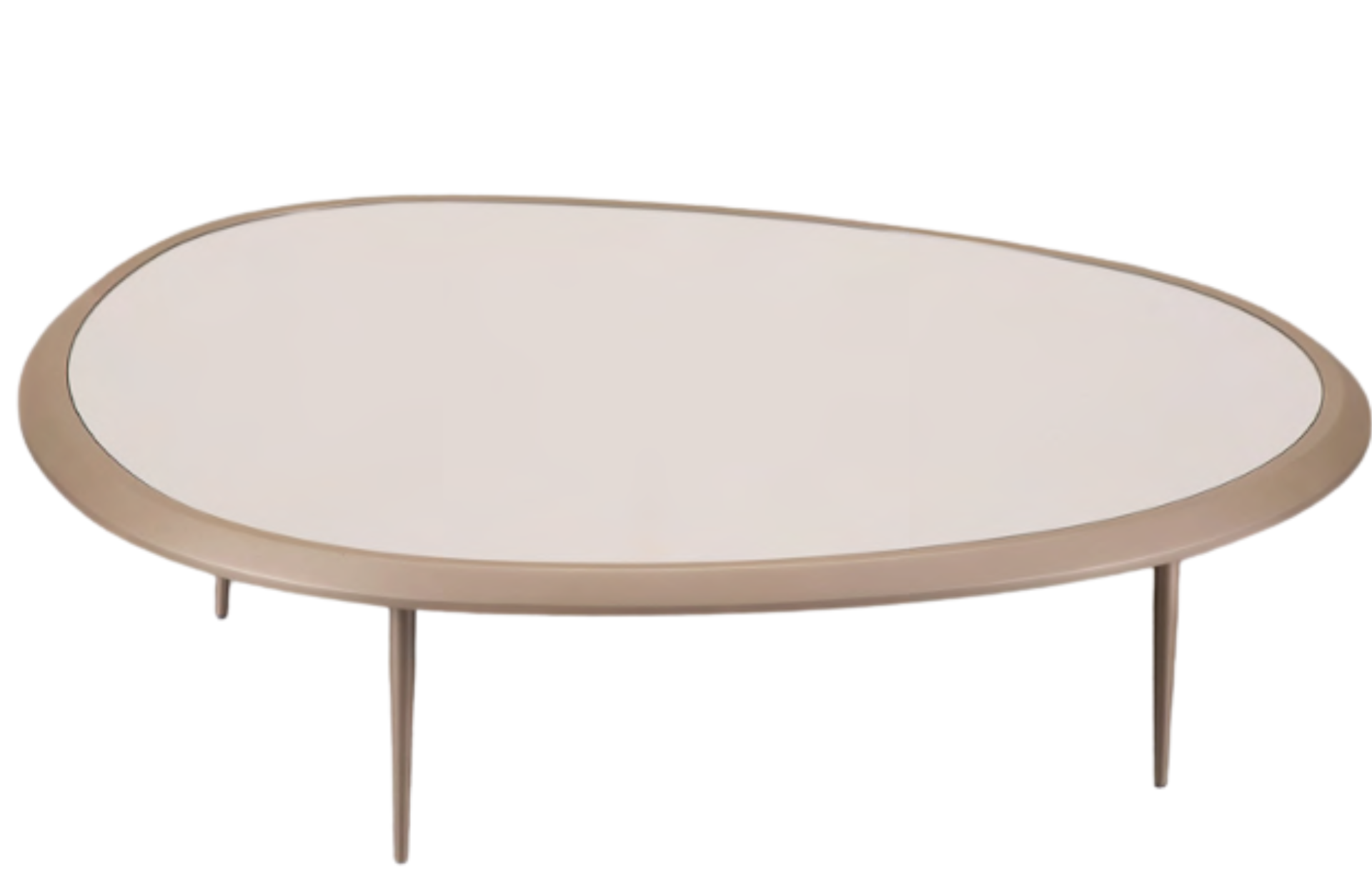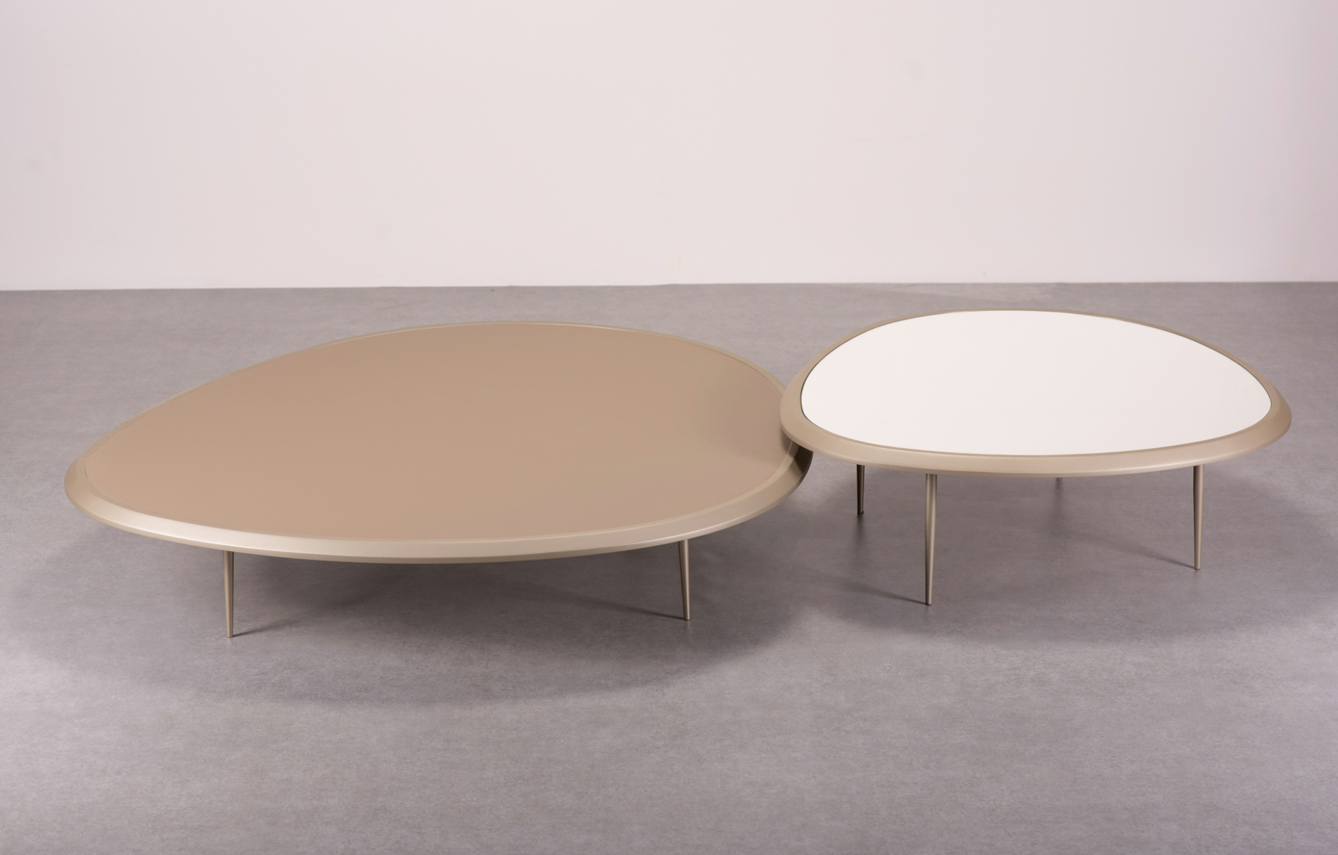 Mesa de Centro Modula com opções de tampo em borda laqueada ou laminada, com fundo em recouro ou espelho (somente para versão alta). Pés em aço carbono pintado.