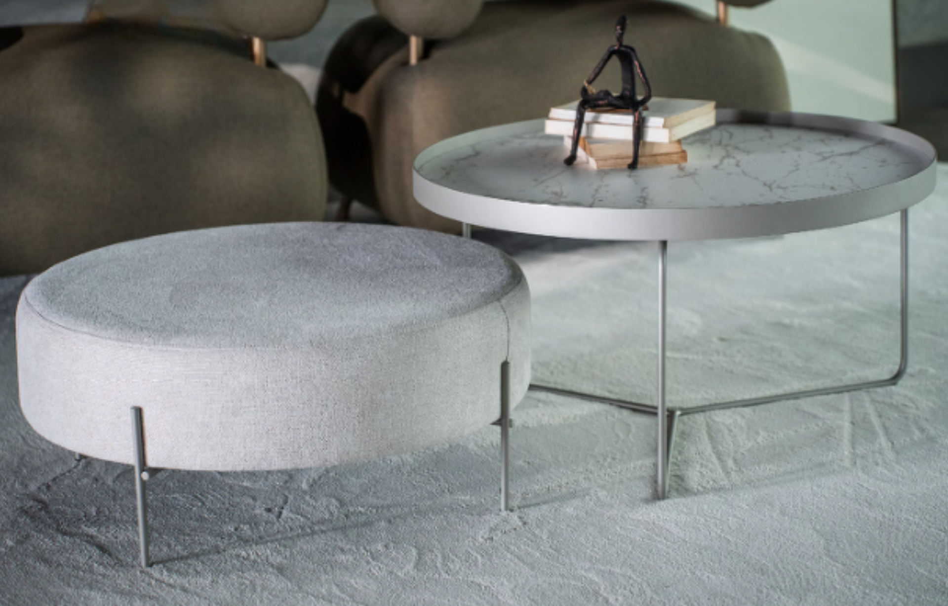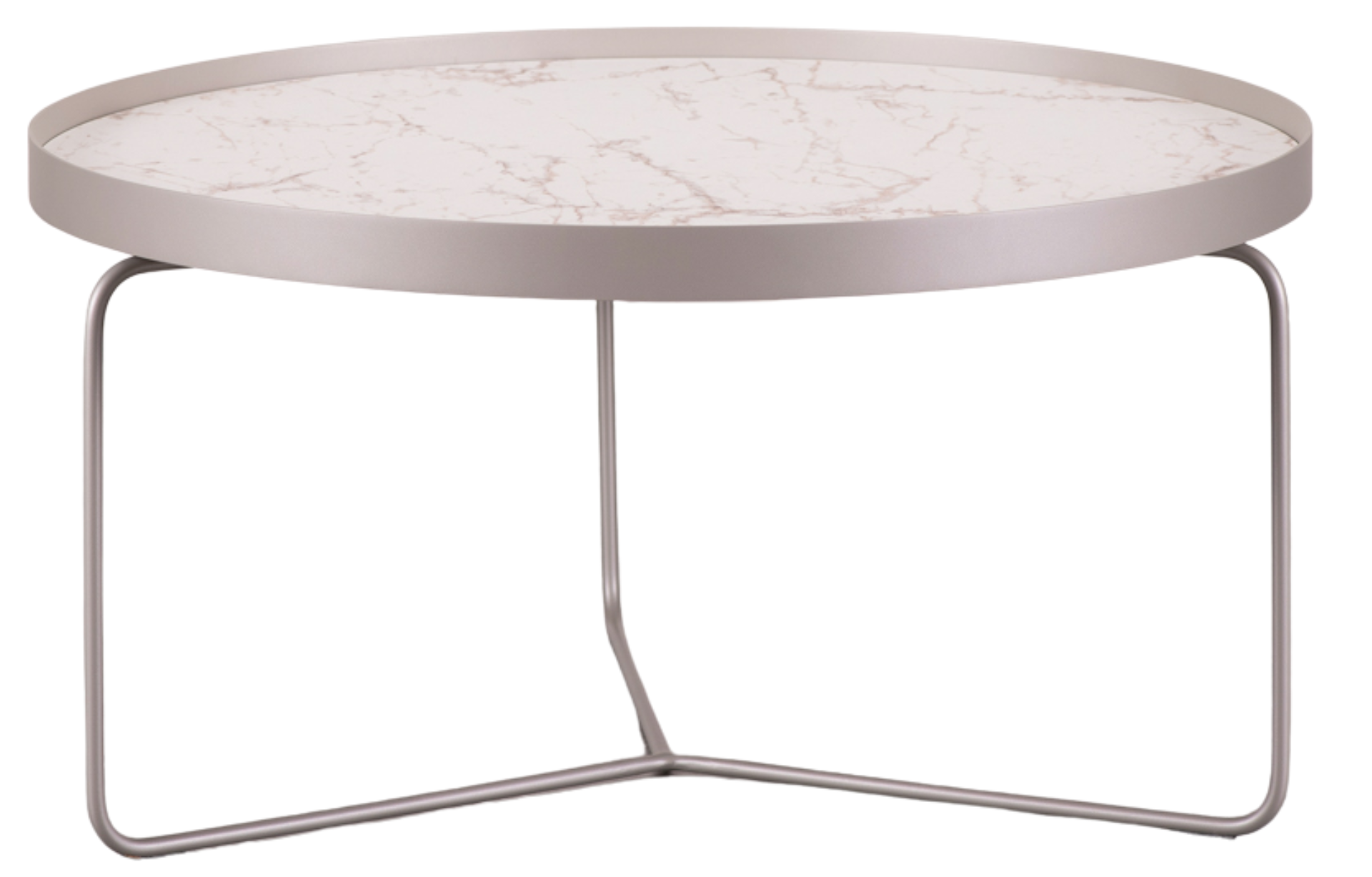 Mesa de Centro Orbit com tampo tipo bandeja, borda laqueada e fundo em MDF, BP ou recouro. Base em aço carbono pintado.