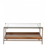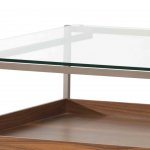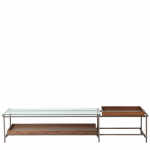 Estrutura em aço carbono tratado com antioxidante, 2 camadas de primer, laca e verniz poliuretânico. Tampo lateral e inferior em MDF laminado natural (Freijó, Nogueira, Jequitibá tonalizado ou ebanizado) ou lacas. Tampo superior em vidro 8 mm