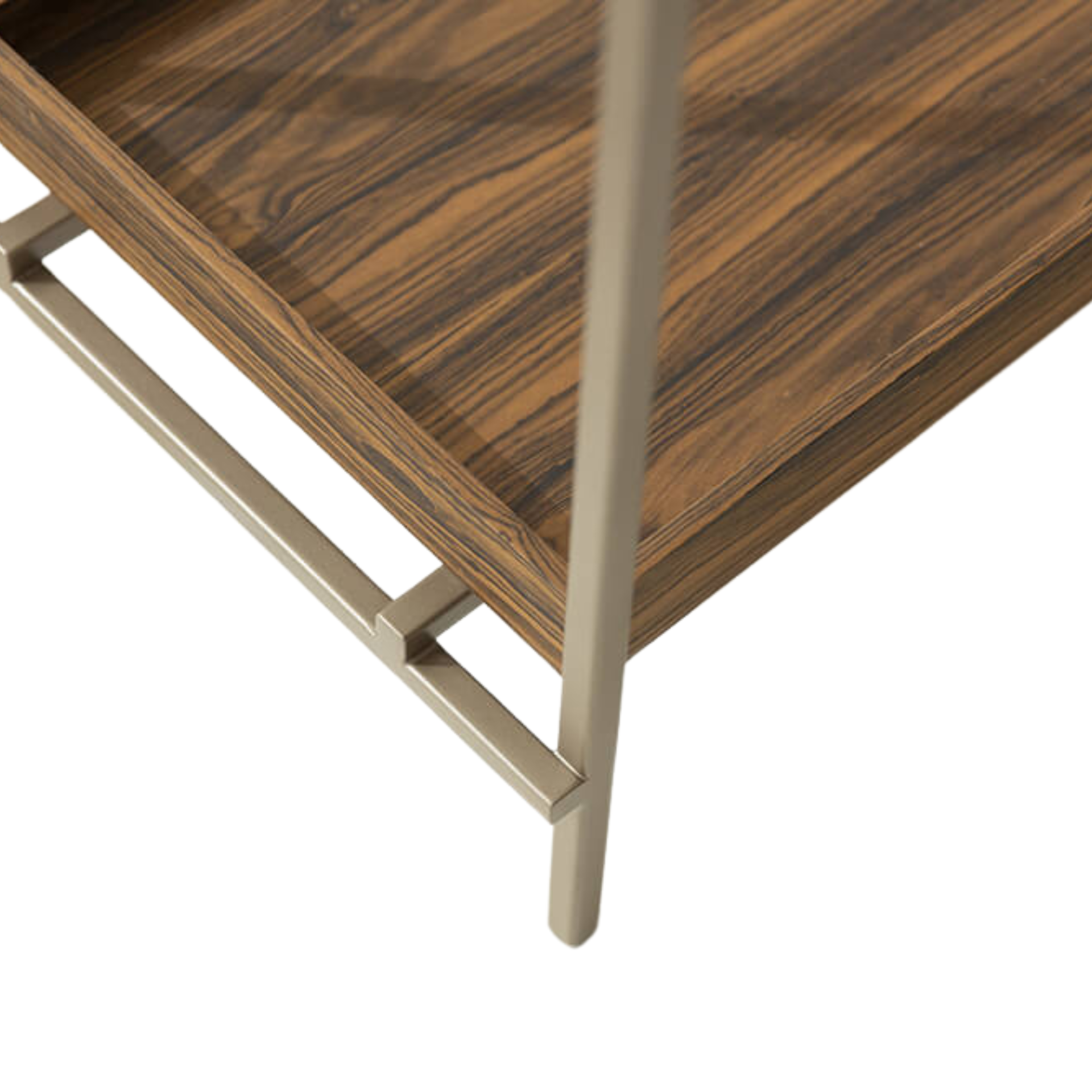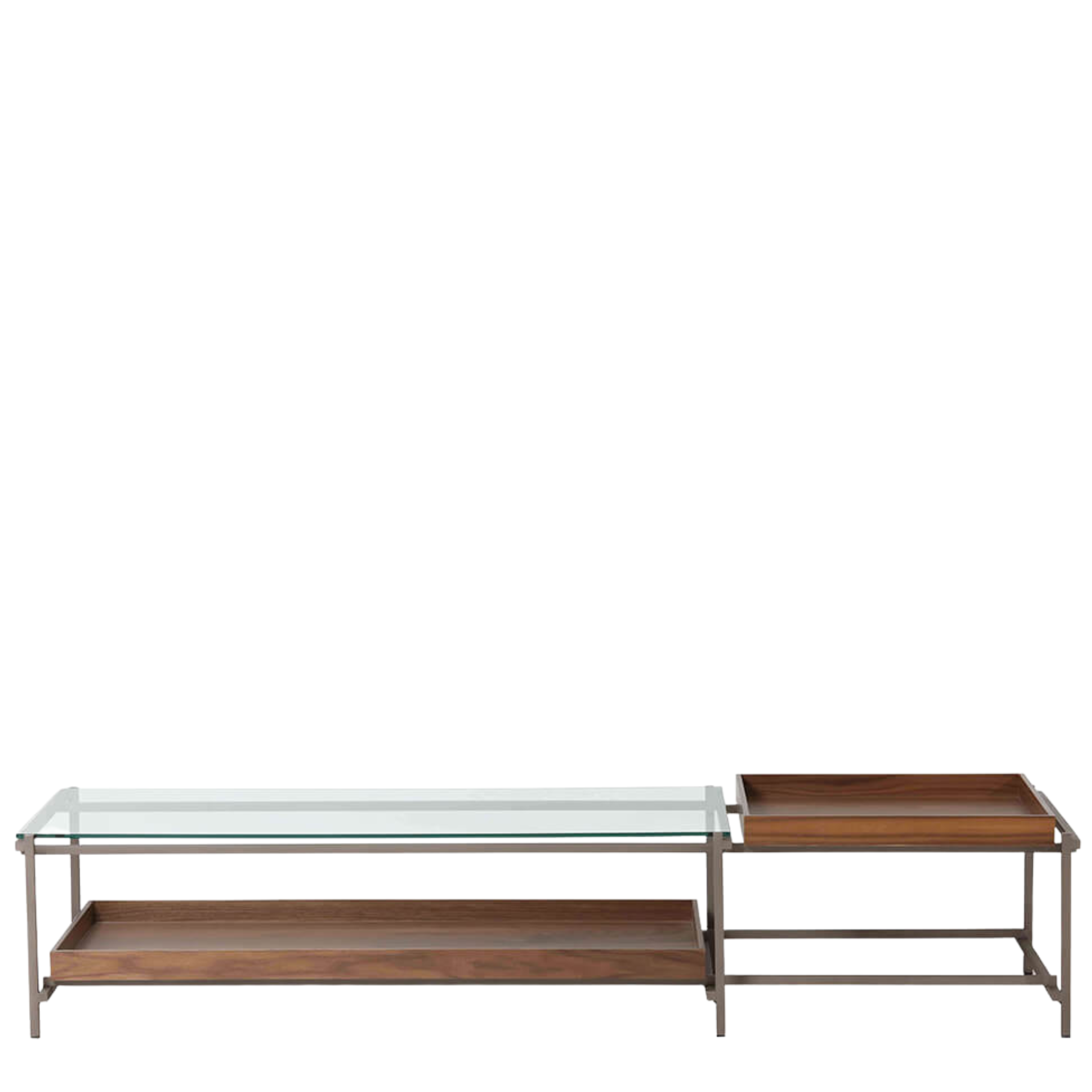 Estrutura em aço carbono tratado com antioxidante, 2 camadas de primer, laca e verniz poliuretânico. Tampo lateral e inferior em MDF laminado natural (Freijó, Nogueira, Jequitibá tonalizado ou ebanizado) ou lacas. Tampo superior em vidro 8 mm