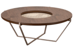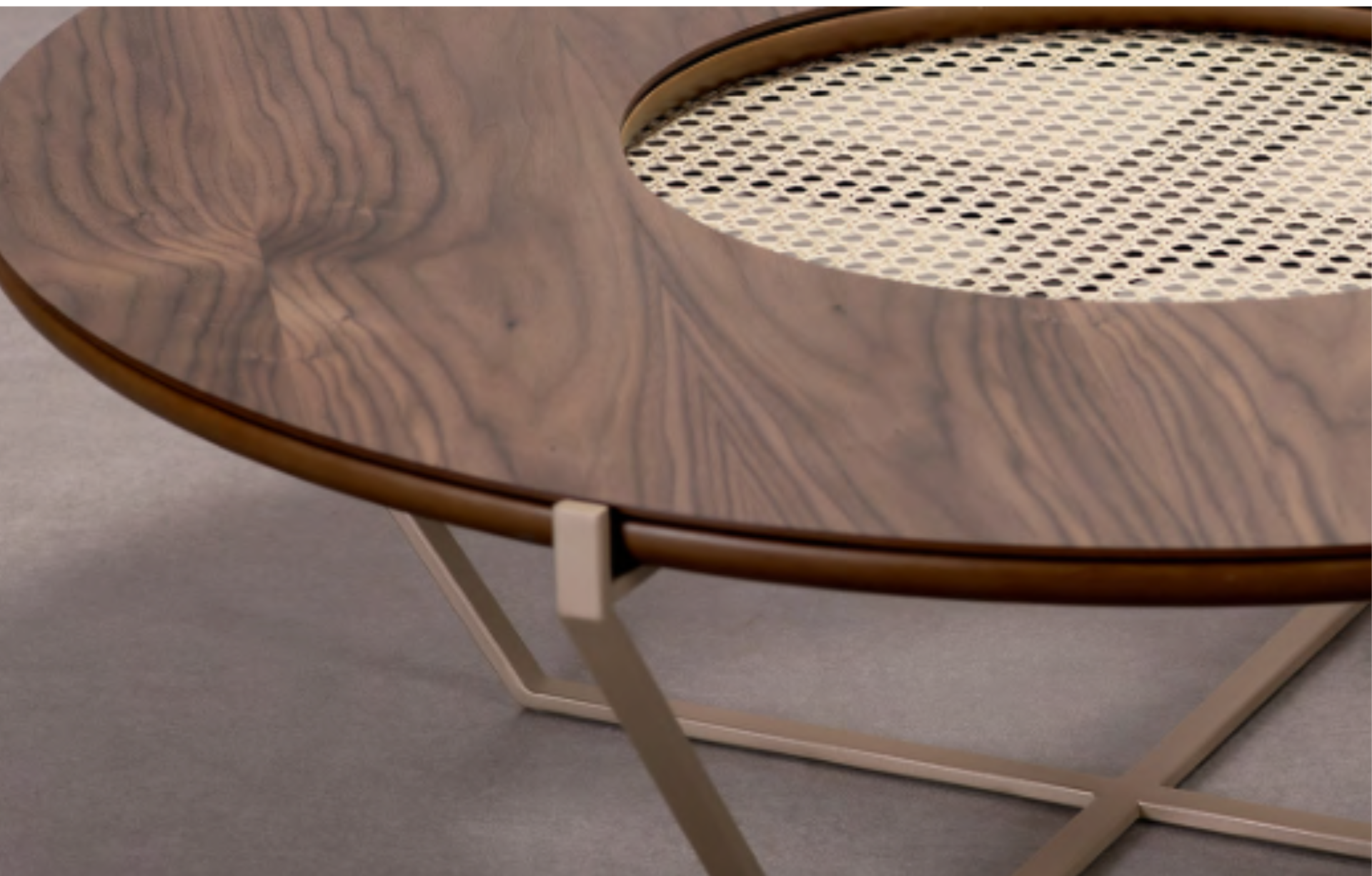 Mesa de Centro Prelude com tampo redondo laminado ou laca com fundo em recouro ou tela palha.