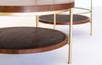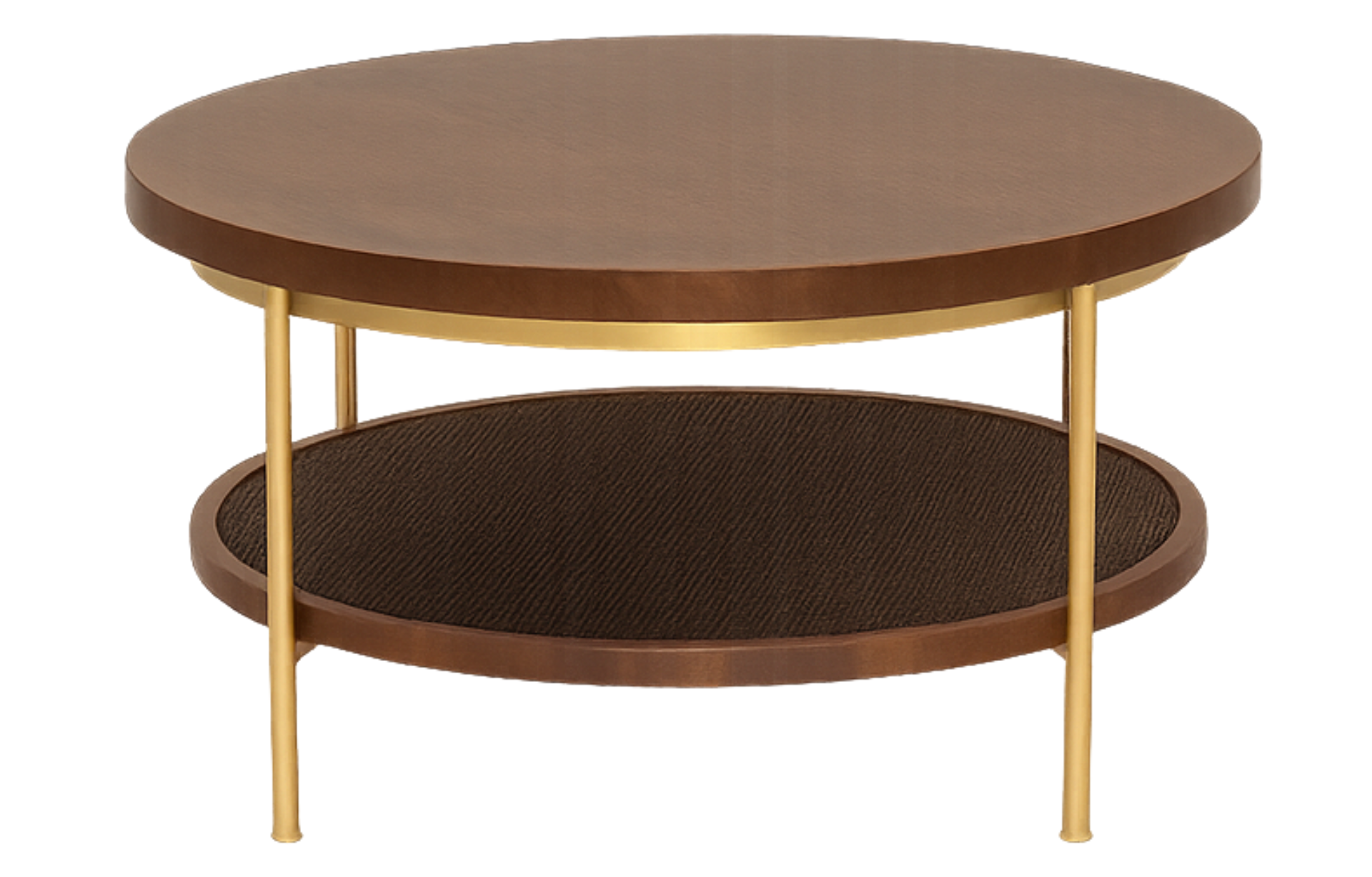 A Mesa de Centro Tahoe apresenta um design elegante e funcional, com um tampo de madeira maciça e uma prateleira inferior. A estrutura em metal leve, com acabamento dourado, une os dois tampos e os pés, conferindo um visual sofisticado e minimalista à peça.
