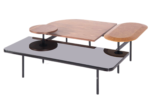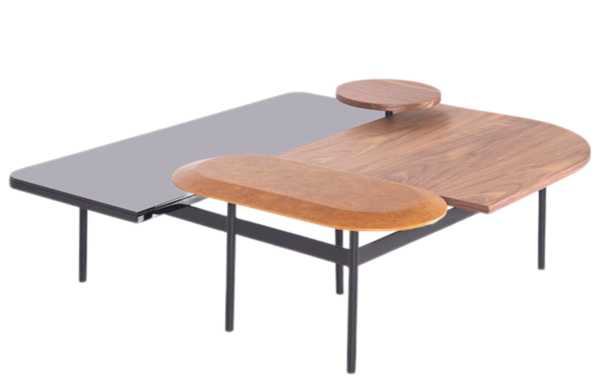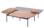 Mesa de Centro Vyse I com estrutura em Alumínio, tampos em Lâmina Cinamomo e Vidro Comum 4mm e detalhe Laminado.