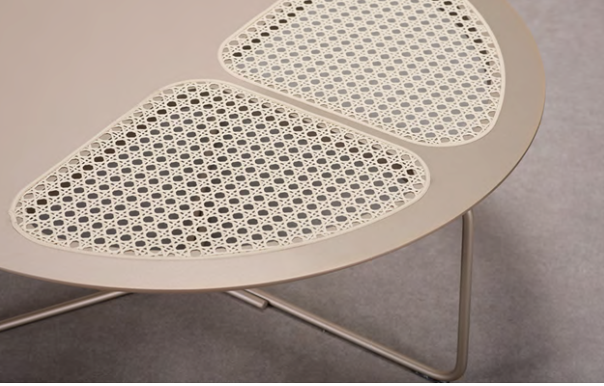 Mesa de Centro Waly com tampo redondo com detalhe em tela palha. Base em aço carbono pintada.