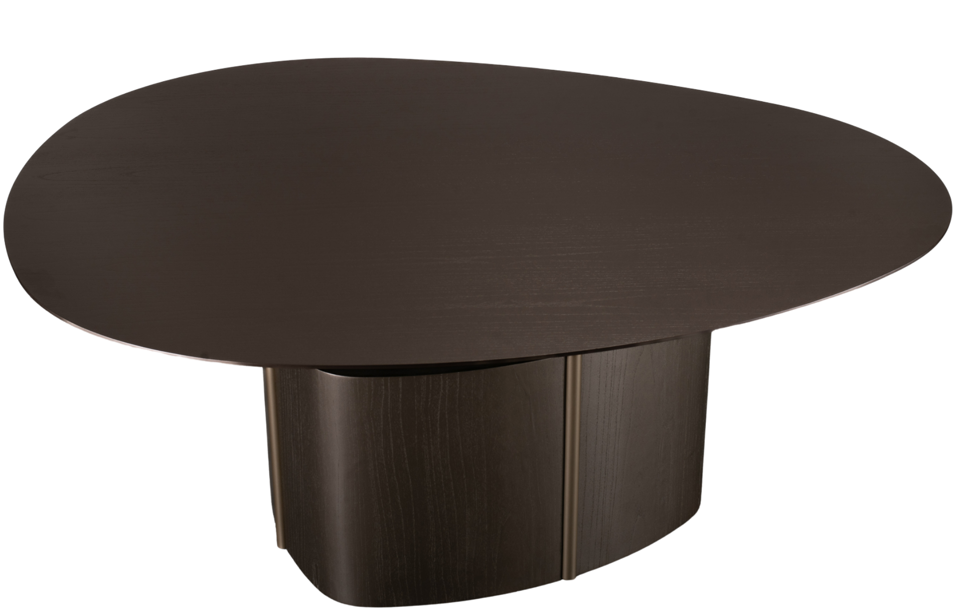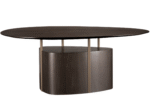 Mesa de Jantar British com tampo orgânico, aplique em lâmina natiural de madeira ou BP. Haste em aço carbono pintado e base laminada ou pintada.