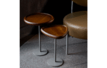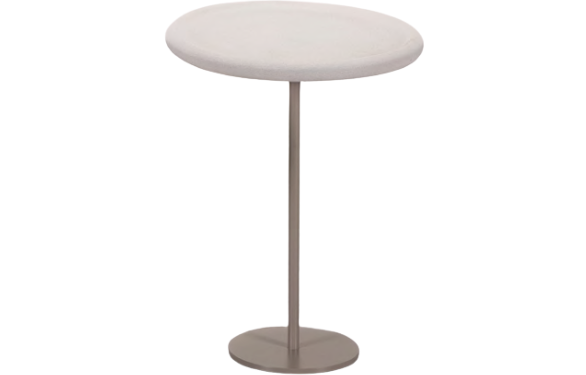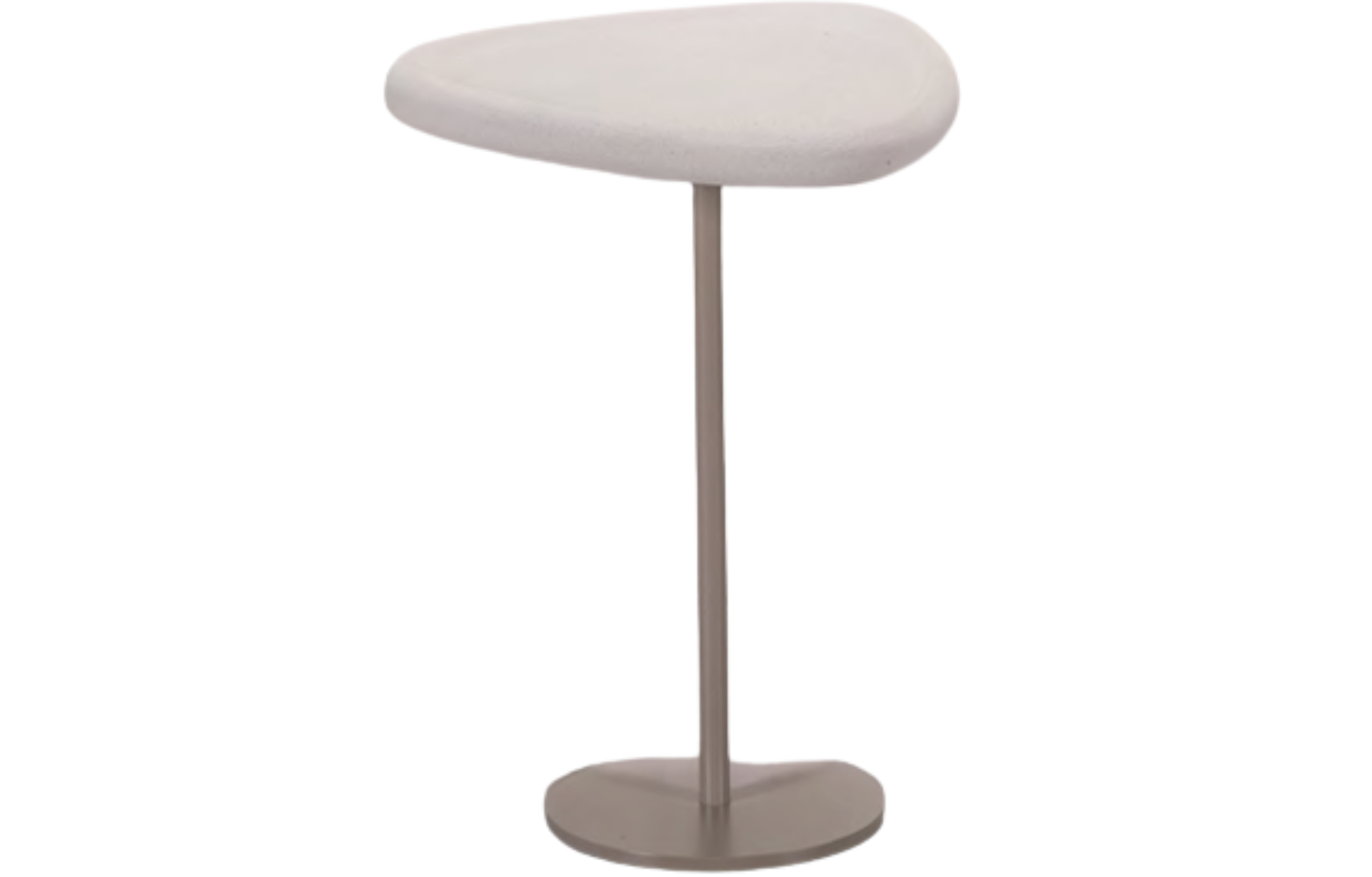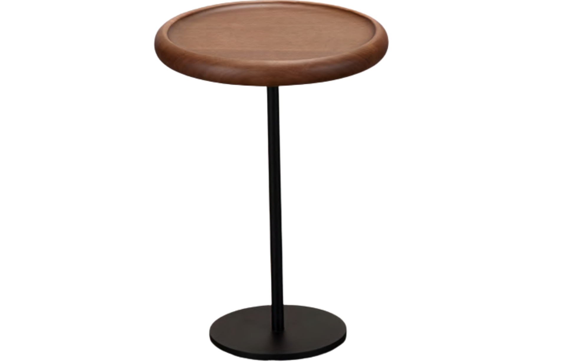 Mesa Lateral Monet com tampo em madeira nas cores natural, castanho e ebanizado ou, cimento. Redondo ou no formato orgãico. Base em aço carbono pintada.