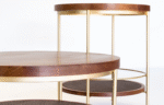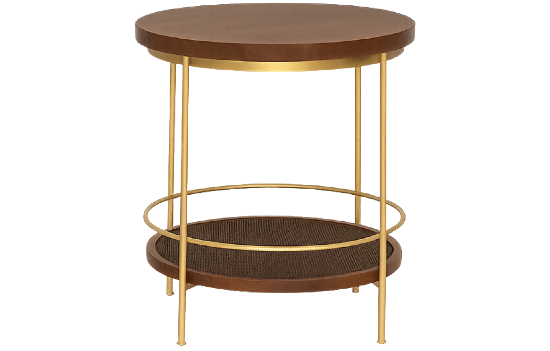 Mesa Lateral Tahoe, com design circular e elegante, combina a solidez da madeira com a leveza da estrutura em metal. A peça é composta por um tampo principal e um tampo inferior, unidos por hastes de metal fino, que também formam um anel decorativo na altura da prateleira inferior, conferindo um visual sofisticado e funcional.