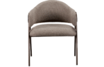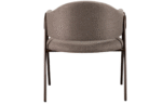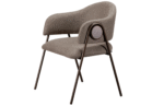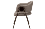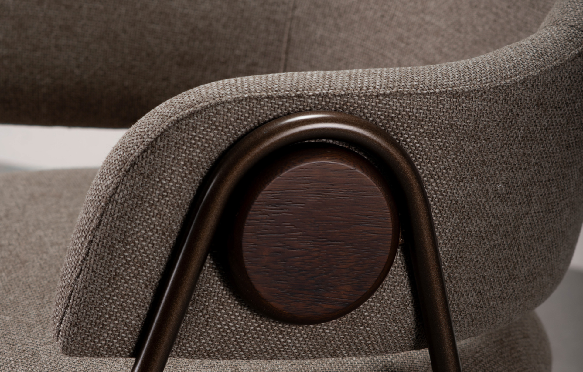 Poltrona Foshan com assento e encosto estofados, base em aço carbono pintado e detalhe no encosto em madeira, disponível nos acabamentos natural, castanho ou ebanizado.