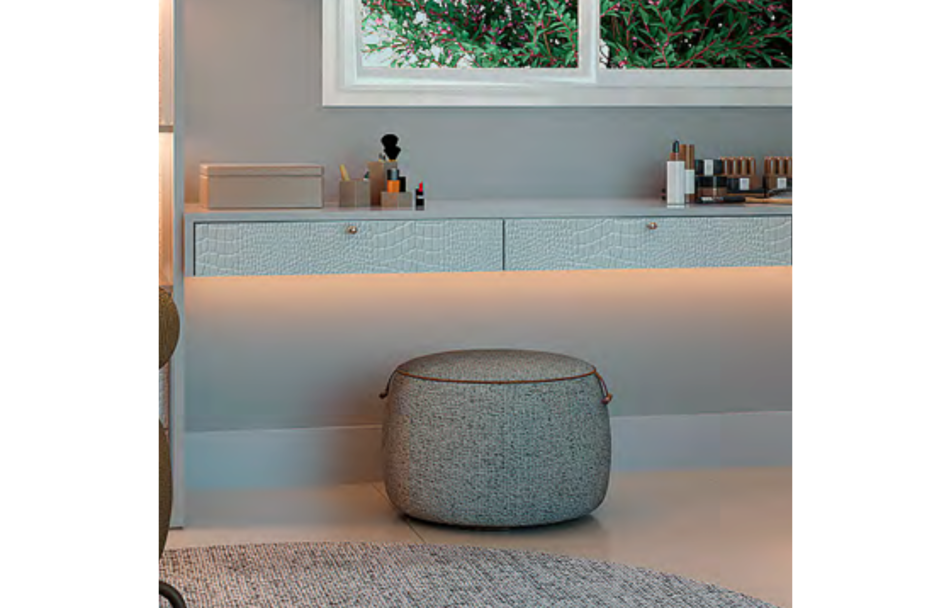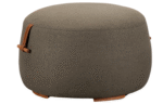 Puff Close redondo com assento em espuma D26, base e puxador em madeira natural.