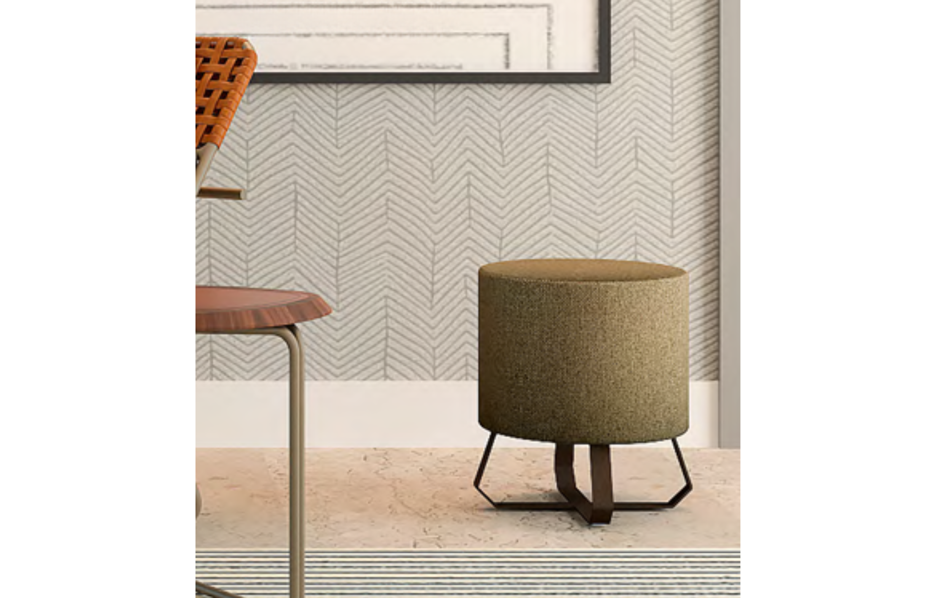 Puff McRae redondo estofado com estrutura em aço carbono cortado a laser e pintura de acabamento, espuma D26.
