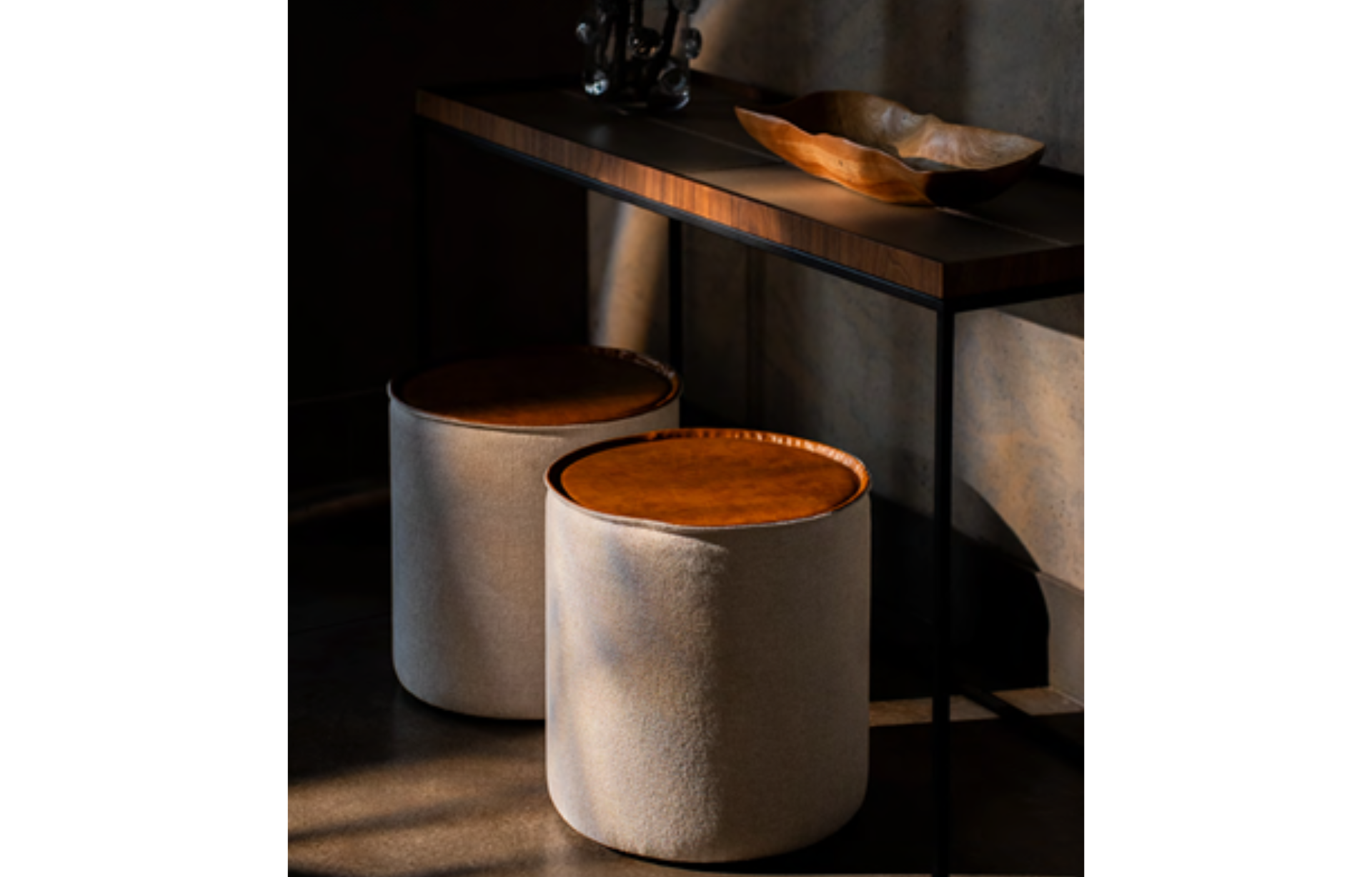 Puff Nuban estofado com opção de combinação de dois tecidos, sendo o valor final baseado no tecido do grupo de maior custo. Espuma D26
