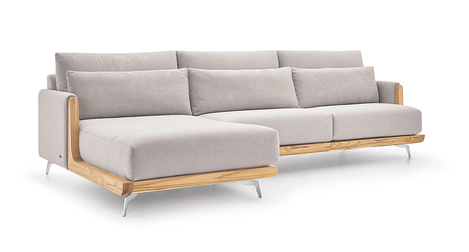 Estofado com estrutura em madeira maciça revestida com espuma e tecido, conta com almofadas do encosto em espuma e fibra. Pés de alumínio.