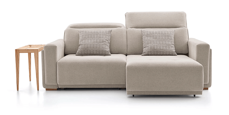 Sofá de estrutura de madeira maciça com assento e encosto estofados com espuma revestida por uma manta de espuma ecosoft. Contém ainda sistema retrátil de assento e regulagem de encosto.